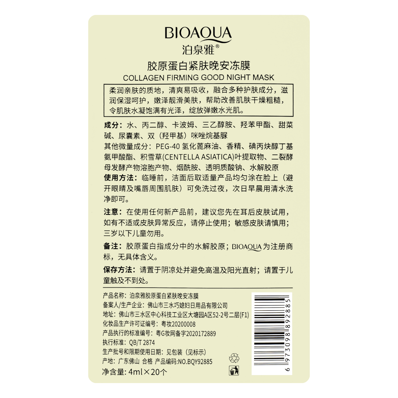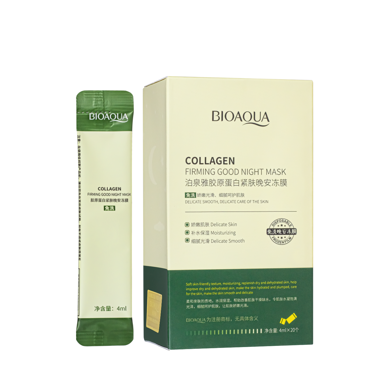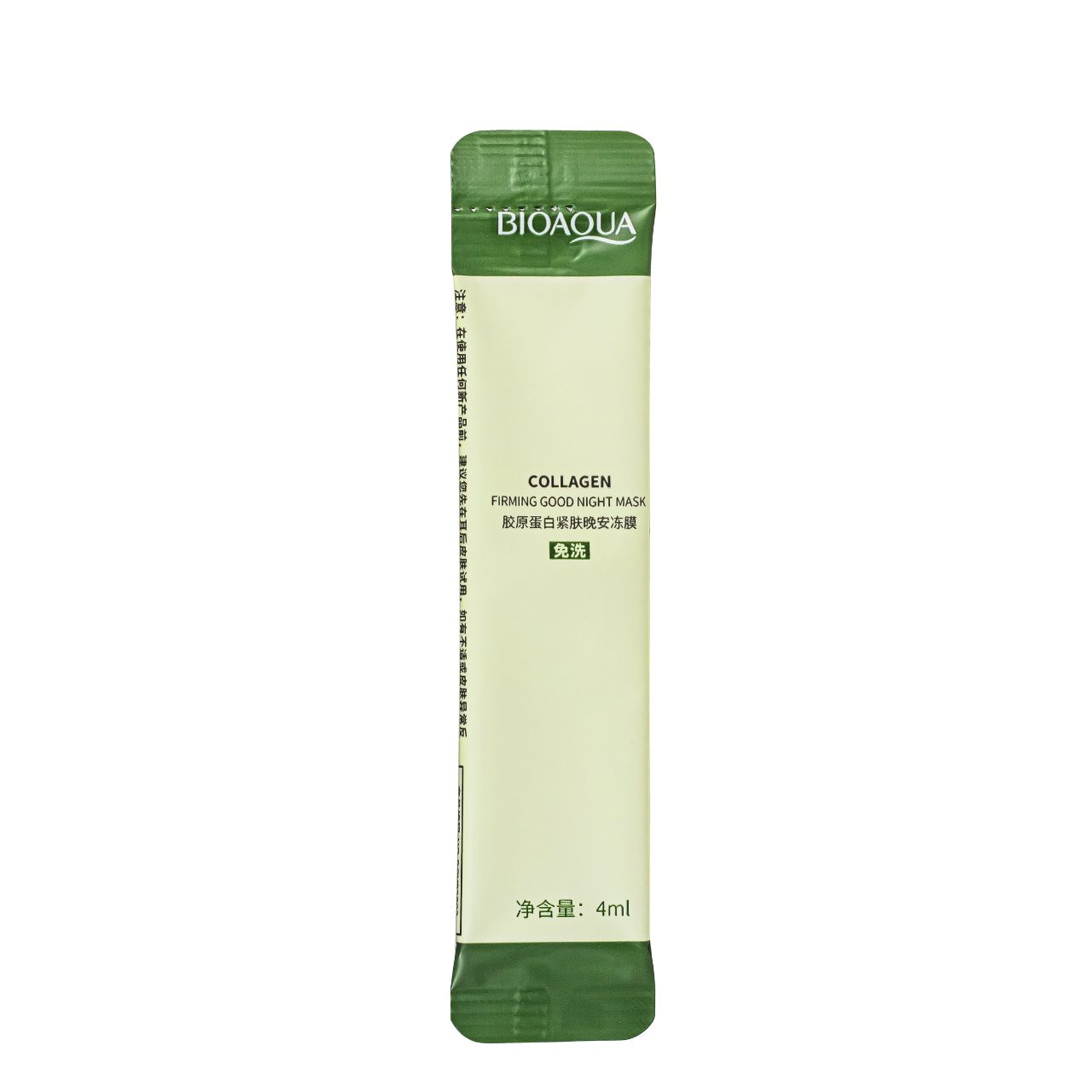 Нічна маска для обличчя з колагеном Bioaqua Collagen Firming Sleeping MaskЗміцнювальна нічна маска Bioaqua Collagen Firming Sleeping Mask з для підвищення пружності й еластичності шкіри. Засіб зміцнює тургор шкіри, підвищує еластичність епідермісу та усуває шкірні заломи. Має омолоджувальну дію, уповільнює процеси старіння та зменшує глибину зморщок. Маска підходить для будь-якого типу шкіри.Вона має активно виражений антибактеріальний ефект, сприяє швидкому загоєнню ранок, знижує чутливість шкіри та зміцнює судини. Стимулює вироблення колагену, підтягує овал обличчя, зменшує зморшки, позбавляє сухості. Нічна маска набагато ефективніша за денну, оскільки довше перебуває на шкірі. До того ж вночі активуються омолоджувальні процеси, тому маски з ліфтинг-ефектом максимально ефективні.Маска виготовлена у зручному пакованні, у формі стіка 4 мл, її можна взяти із собою в дорогу й вона не займає багато місця.Склад:Екстракт центели азійської — один з улюблених усіх азійських жінок. Він багатий на вітаміни та мікроелементи, завдяки чому миттєво впливає на шкіру та покращує її стан. Надає загоювальну, антисептичну, протизапальну та зволожувальну дію. Прискорює регенерацію клітин, завдяки чому шкіра оновлюється швидше і це важливо як для вікової, так і для проблемної шкіри.