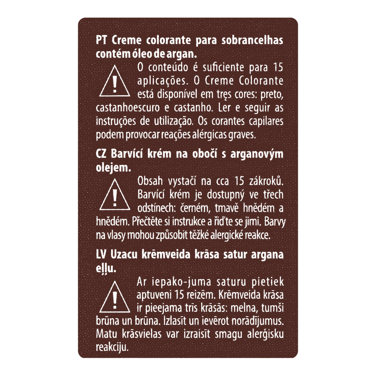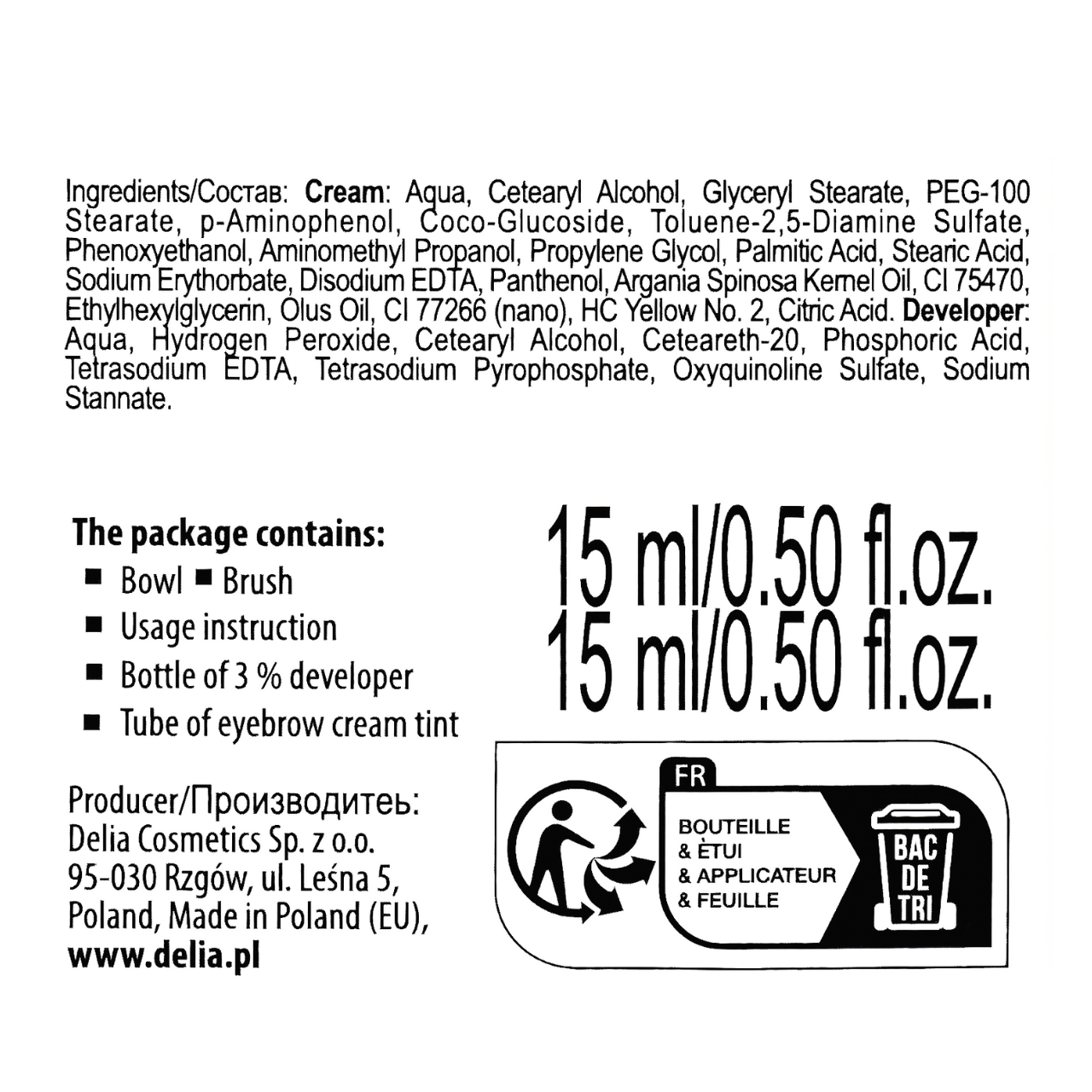 Крем-фарба для фарбування брів без аміаку Delia Cosmetics Color Cream з олією аргани та D-пантеноломМ'яка фарба для брів з олією аргани без аміаку дбайливо забарвлює їх, дуже проста і зручна у використанні. Засіб для фарбування брів без різкого запаху, ідеально підходить для чутливої шкіри. Крем-фарба для брів містить пантенол, який зволожує волоски та захищає від пошкоджень.Одного паковання вистачає до 15 фарбувань.Спосіб застосування:Перед процедурою проведіть тест на чутливість шкіри. Змішайте близько 1 см крему з 10-12 краплями активатора з пляшечки до однорідної консистенції. Нанесіть суміш на брови та залиште на 5-10 хвилин. Фарбу змийте молочком для демакіяжу, а потім чистою водою. Після фарбування рекомендується нанести зволожуючий крем.Склад: Вода, Цетеарил алкоголь, прив'язка-100 Стеарат, Гліцерил Стеарат, Кокоглюкозид, Амінометил Пропанол, Пропілен Глюколь, Толюен-2,5-Діамін Сульфат, Стеаринова кислота, Пальмінова кислота, Метилпарамон, Сопідіа , ВНТ, СЛ 77266, СЛ 75470, 2,4-Діамінофеноксиетанол ПСП.Об'єм: 15 мл + 15 мл