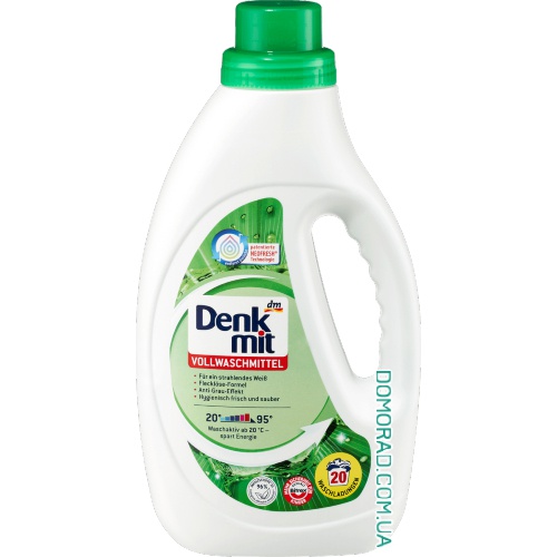 спеціальною формулою проти утворення сірої димки на одязі та ефекту жовтизни після багаторазового прання. Denkmit Vollwaschmittel підходить для прання у всіх температурних