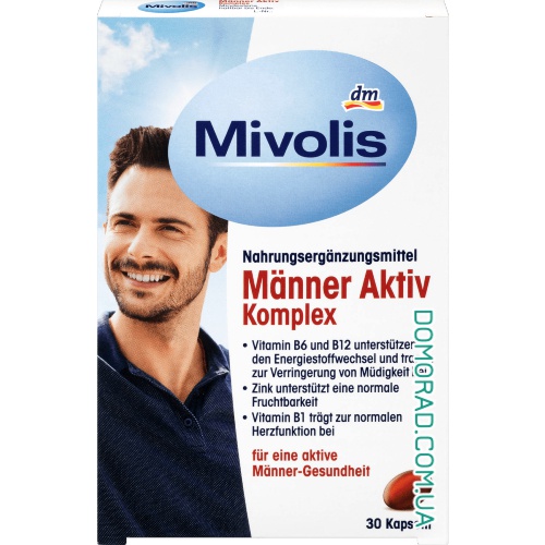 Активний комплекс капсули для чоловіків Mivolis сприяє постачанню вітамінів, мінералів та інших високоякісних інгредієнтів і спеціально підібрані до потреб чоловіків. Вітаміни В6, В12 та С сприяють нормальному енергетичному обміну та зменшенню стомлюваності та втоми. Вітамін В1 підтримує роботу серця. Вітамін В6 допомагає регулювати гормональну активність. Вітамін С, селен та цинк сприяють нормальній роботі імунної системи та допомагають захистити клітини організму від окислювального стресу. Цинк підтримує ґ нормальної функцію шкіри та волосся. Цинк допомагає підтримувати нормальний рівень тестостерону в крові. Не тільки жінки, а й чоловіки можуть впливати на тему «бажати дітей». Цинк сприяє нормальній фертильності та розмноженню, а селен підтримує утворення сперми. Цей склад доповнюється іншими інгредієнтами, такими як олія гарбузового насіння, L-карнітин та астаксантин.