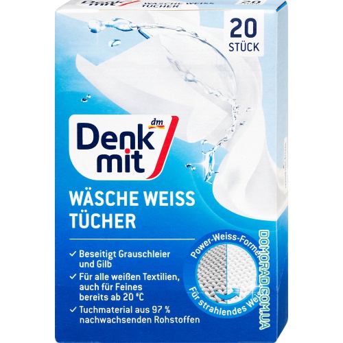 Серветки проти передавання відтінків між тканинами під час прання. Серветки для білого Denkmit видаляють сіру вуаль і жовті плями з білого текстилю. Активні інгредієнти вивільняються під час використання і не дозволяють сірому нальоту осідати а одязі. Ці серветки підходять для всіх температурних діапазонів і тонких волокон - для блискучої білизни одягу.