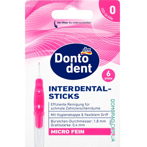 Міжзубні йоржики Dontodent, мікро дрібні, 0,4 мм, підходять для вузьких міжзубних просторів. Вони пропонують ефективне очищення між зубами - особливо на ходу, поза межами дому. Ідеальні для зубів з брекетами, імплантами тощо.