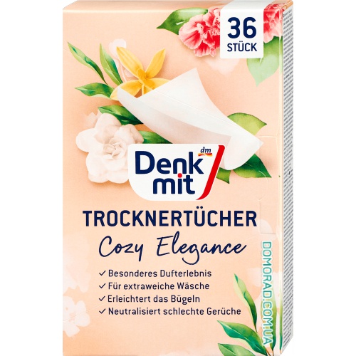 Завдяки свіжому аромату Cozy Elegance, серветки для сушильної машини Denkmit забезпечують особливий аромат. У той же час вони зменшують електростатичний заряд і зминання, полегшуючи прасування. Також нейтралізуються такі запахи, як піт і дим. Тканини одягу стають м'якими та пухнастими - щоб білизна була приємною на дотик.