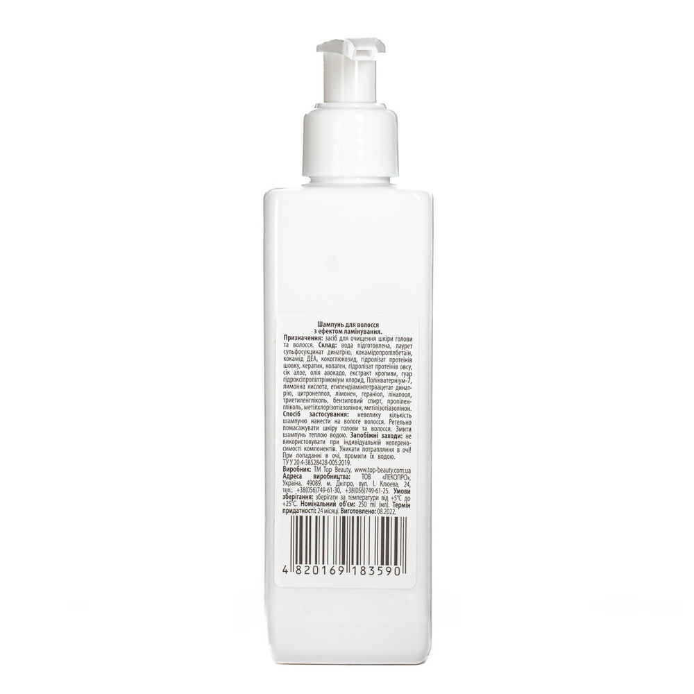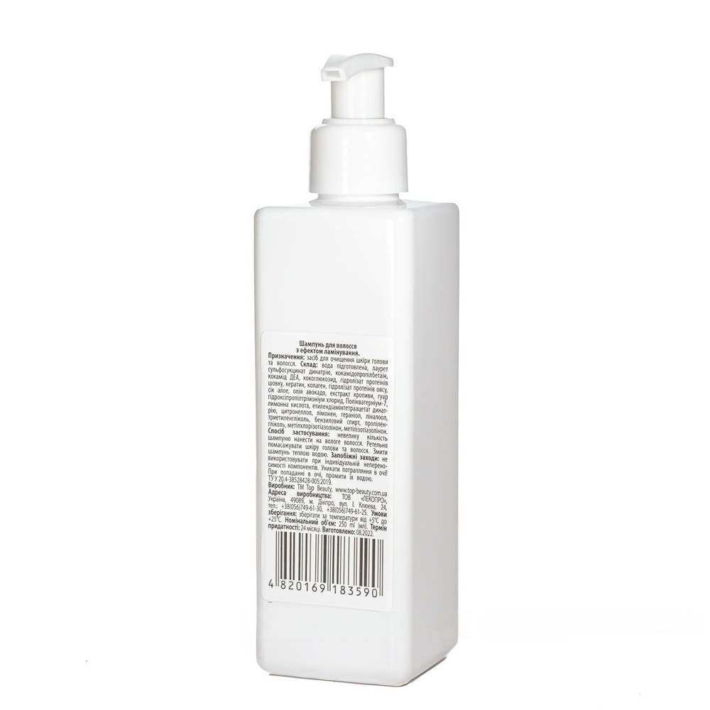 Ламінувальний шампунь Top Beauty — перший крок у догляді за тьмяним волоссям. Діє як антиоксидант, захищає волосся і колір від вимивання пігменту, вигоряння та пересушування на сонці. Захищає від зовнішніх, хімічних, механічних та атмосферних ушкоджень. Активна формула шампуню чудово очищає волосся і шкіру голови, паралельно надаючи зволожувальну та пом'якшувальну дії.