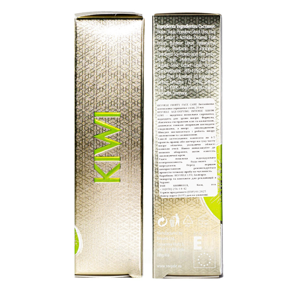 Антивікова сироватка для обличчя Revuele Age-Defying Intense Serum Kiwi з екстрактом ківі 30 млЦе щоденна поживна сироватка, що підходить для зрілої шкіри. Формула, збагачена екстрактом ківі та колагеном, розгладжує дрібні зморшки та омолоджує шкіру. Вона швидко вбирається і робить шкіру зволоженою та заспокійливою.Спосіб застосування: наносите 4-5 крапель вранці або ввечері на суху та чисту шкіру обличчя, уникаючи області навколо очей. М'яко помасажуйте до повного вбирання, потім нанесіть зволожуючий крем.Об'єм: 30 мл
