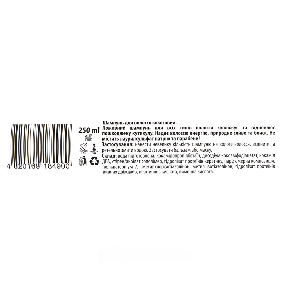 Його делікатна формула збагачена кокосовим маслом, що забезпечує стимуляцію регенерувальних процесів, у результаті чого в структурі волосся інтенсивно заповнюються порожні ділянки, згладжуються розпушені кутикули та запаюються посічені кінчики.