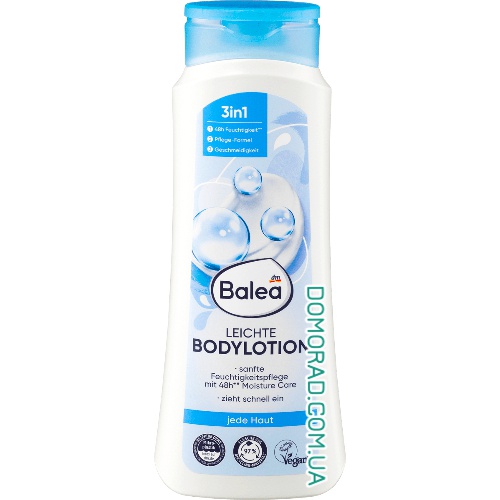 Легкий лосьйон для тіла Balea доглядає за шкірою з цінними рослинними продуктами - для щоденного чудового самопочуття та очевидно свіжої та еластичної шкіри. Легка емульсія лосьйону добре поширюється і швидко вбирається.