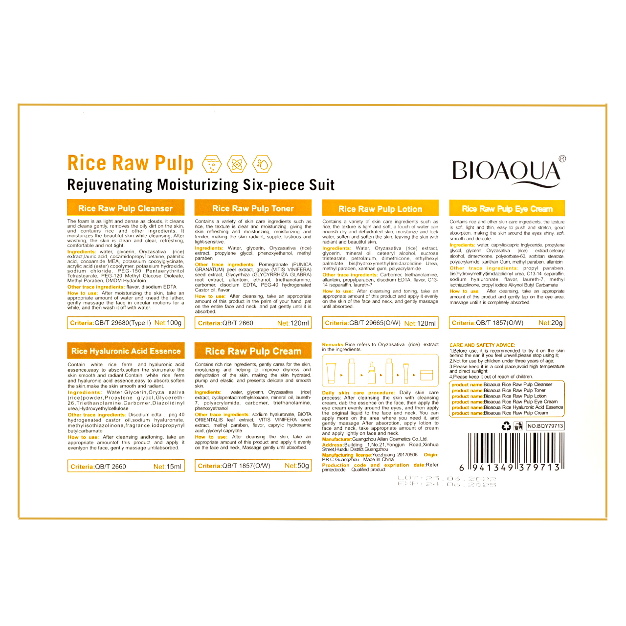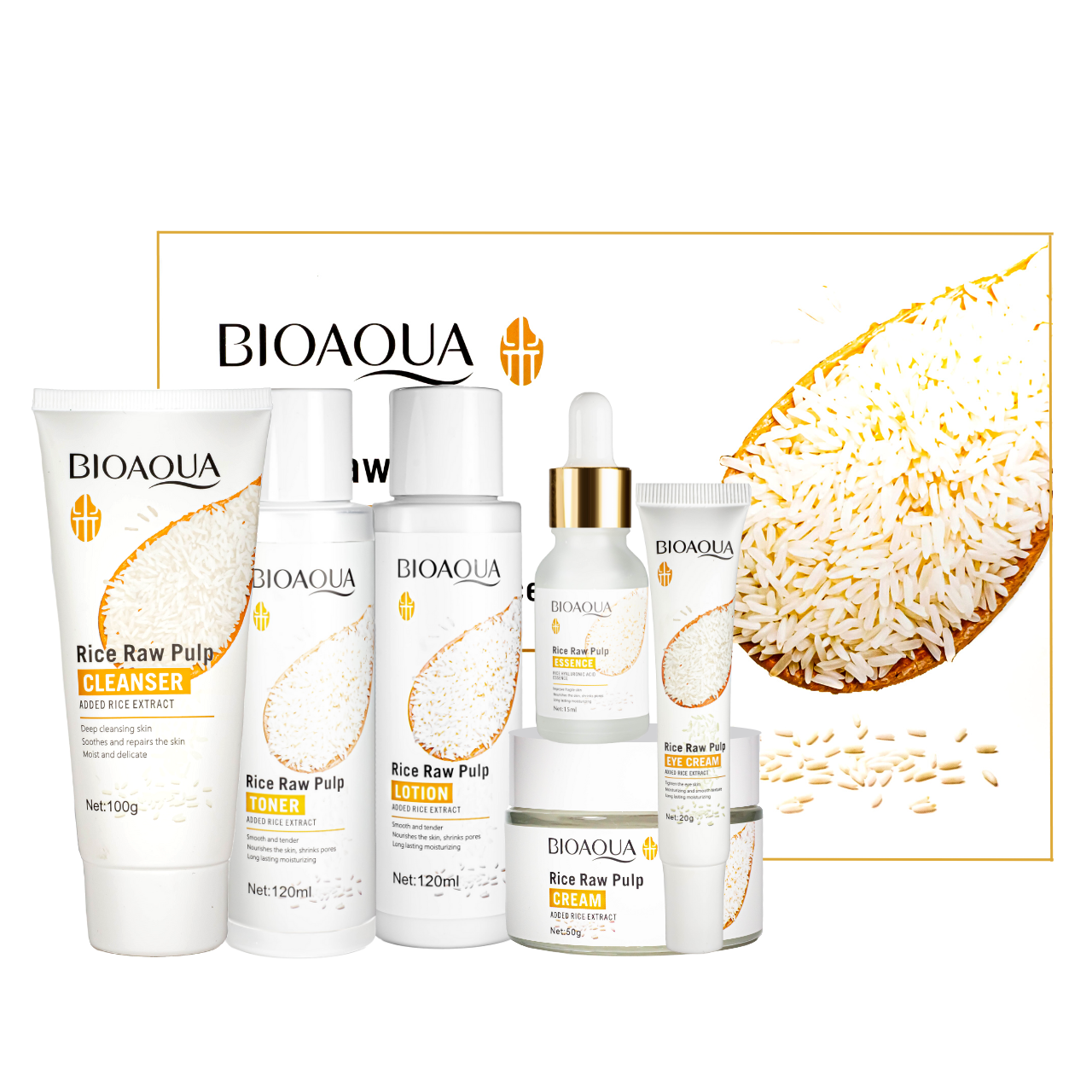 Омолоджувальний набір косметики для догляду за обличчям 6 в 1 з екстрактом рису Bioaqua Rice Raw Pulp Set У зволожувальний набір, що омолоджує, з екстрактом рису Bioaqua Rice Raw Pulp Set входять всі необхідні засоби для щоденного догляду за обличчям для будь-якого типу шкіри. Набір включає:Очищувальна пінка. Легка і густа, відмінно очищає і м'яко видаляє забруднення зі шкіри. Містить екстракт рису та інші інгредієнти, які зволожують шкіру під час очищення. Після вмивання обличчя чисте, свіже, немає відчуття стягнутості. Об'єм: 100 г. Лосьйон. Містить екстракт рису, який чудово живить суху та зневоднену шкіру. Лосьйон пом'якшує обличчя, роблячи його сяючим і красивим. Об'єм 120 мл. Тонер для обличчя. Містить екстракт рису, легка текстура надає шкірі свіжості та зволоження. Об'єм 120 мл. Есенція з гіалуроновою кислотою. Містить фермент білого рису та гіалуронову кислоту, легко вбирається, пом'якшує шкіру, робить її гладкою та сяючою. Об'єм 15 мл. Крем під очі. Текстура у крему м'яка, легка та ніжна. Добре розподіляється, робить шкіру навколо очей блискучою, м'якою, гладкою та ніжною. Об'єм 20 р. Зволожувальний крем для обличчя. Ніжно доглядає шкіру, зволожує та допомагає зменшити сухість та зневодненість. Після застосування шкіра стає пружною та еластичною. Об'єм 50 г.Спосіб застосування:невелику кількість пінки нанесіть на вологе обличчя. М'яко масажуйте обличчя круговими рухами протягом деякого часу, потім змийте залишки пінки водою; нанесіть потрібну кількість тонера на ватяний диск і протріть шкіру обличчя, рухаючись від центру до периферії. Можливе нанесення подушечками пальців; після очищення та тонізування використовуйте лосьйон: рівномірно нанесіть його на шкіру обличчя та шиї, м'яко помасажуйте. Уникайте ділянок навколо очей; крем для шкіри навколо очей нанесіть легкими рухами на ділянку навколо очей масажуйте його до повного поглинання; кілька крапель есенції рівномірно нанесіть на обличчя, м'яко масажуйте; Після використання попередніх позицій набору, рівномірно нанесіть крем на обличчя та шию, м'яко масажуйте до повного поглинання.