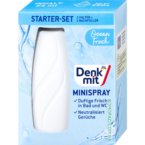 Завдяки композиції океанських свіжих ароматів практичний міні-спрей Ocean Fresh від Denkmit забезпечує приємну атмосферу гарного настрою у ванній кімнаті та туалеті. Одного картриджа вистачає приблизно на 260 застосувань.