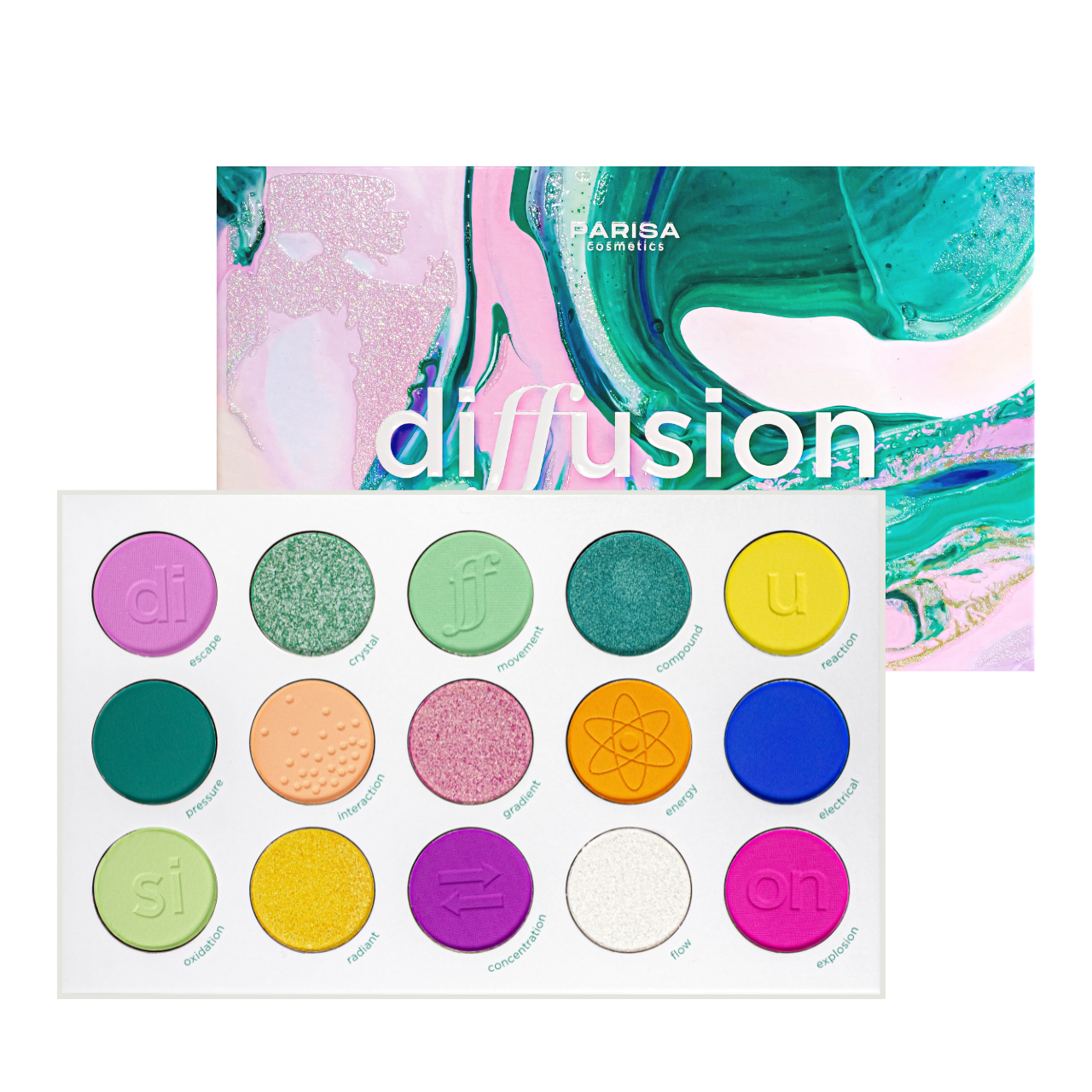 Палетка тіней для повік Parisa Cosmetics Diffusion із 15 яскравих глітерних, шимерних, сатинових та матових тонів дозволять втілити найяскравіші образи, надихає на сміливі експерименти, допамогає створити будь-який макіяж – від ніжного, романтичного до яскравого та експресивного.