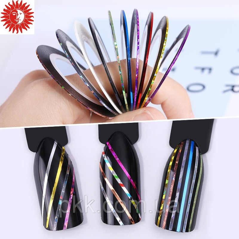 Стрічка для дизайну нігтів striping tapeСтрічка для дизайну - це тоненька смужка, що самоклеїться, виконана в різних кольорах, але обов'язково в блискучому металіку. Стрічка підходить для використання як на лаковому, так і на гель-лаковому або будь-якому іншому штучному покритті, правда тут властивості, що вже самоклеяться, не такі важливі.2 способи, як користуватися стрічкою для нігтів:1 – як декор У першу чергу стрічку використовують для дизайну як аксесуар. Алгоритм дій тут наступний: Виконується стандартна процедура манікюру – відсувається та видаляється кутикула, а нігтю надається красива та росина форма. Ніготь покривається лаком. Якщо покриття однобарвне, то наноситься 2 шари. Гарно виходить, якщо використовується кілька кольорів, а на смужку скріпки прикріплюється стрічка (до того ж вона приховує, якщо щось вийшло нерівно на стику). Покриття може бути також гель-лакове. Відріжте шматочок потрібної довжини. Приклейте його до нігтя відповідно до вигаданого візерунка. Пам'ятайте, покриття має бути висохлим! Якщо десь довжина стрічки трохи більше, ніж потрібно, і виступає за краї, то манікюрними ножицями акуратно видаліть надлишки так, щоб до краю залишався як мінімум міліметр. Поверх нанесіть закріплювач, можна для надійності навіть у 2 шари.2 – як трафарет Другий спосіб використання стрічок для дизайну – як допоміжний матеріал. Наприклад, можна покрити нігті декількома лаками, потім наклеїти смужки в потрібному напрямку та поверх нанести ще один колір лаку. Після його висихання смужки відірвати. У результаті на однотонному тлі вийдуть кольорові смужки – красиво та ефектно. Тільки не забудьте завдати фініш, інакше поверхня буде не рівною.