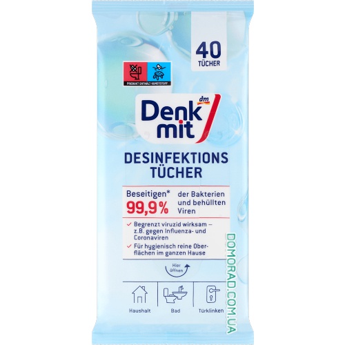 Дезінфікуючі серветки Denkmit надзвичайно швидко та надійно очищають та дезінфікують усі предмети, які можна мити. Вони практичні у використанні та мають приємний свіжий аромат - для легкої та гігієнічної чистоти. Серветки знищують 99,9% бактерій, а також ефективні проти вірусів з оболонкою, таких як віруси грипу А, H1N1 або корона. Серветки усувають 90% алергенів: пилок трав, пилових кліщів, алергени собак, котів.