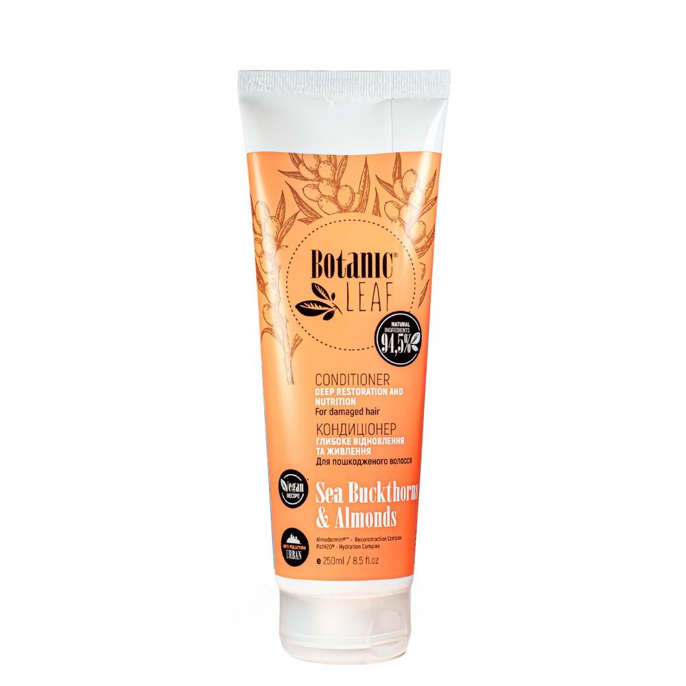 Натуральний кондиціонер для пошкодженого волосся Глибоке відновлення та живлення Sea Buckthorns & Almonds Botanic Leaf Кондиціонер для пошкодженого волосся Botanic Leaf забезпечує інтенсивне відновлення та живлення для волосся, яке потребує особливого догляду. Цей кондиціонер розроблений з використанням інноваційних ботанічних інгредієнтів, які допомагають відновити структуру волосся і повернути йому здоровий вигляд. Особливості кондиціонера для пошкодженого волосся "Глибоке відновлення та живлення" від Botanic Leaf:натуральний склад; рівномірно розподіляється по волоссю; не обтяжує пасма; живить і зволожує волосся; полегшує розчісування й укладання; перешкоджає сплутуванню, ламкості та витонченню; робить локони струмливими й блискучими.Кондиціонер "Глибоке відновлення та живлення" робить волосся м'яким, шовковистим і легким у розчісуванні. Він пом'якшує і розгладжує волосся, покращуючи його текстуру і надає йому здорового блиску. Після застосування кондиціонера волосся відчувається зволоженим, укріпленим. Щоб досягти максимального ефекту, використовуйте інші засоби лінійки Глибоке відновлення та живлення Botanic Leaf — шампунь та крем-маску. Спосіб застосування: нанести кондиціонер на чисте вологе волосся після застосування шампуню. Рівномірно розподілити по всій довжині волосся, залиште на 1-3 хв, потім змийте теплою водою. У разі потрапляння в очі негайно промийте водою. Об'єм: 250 мл.