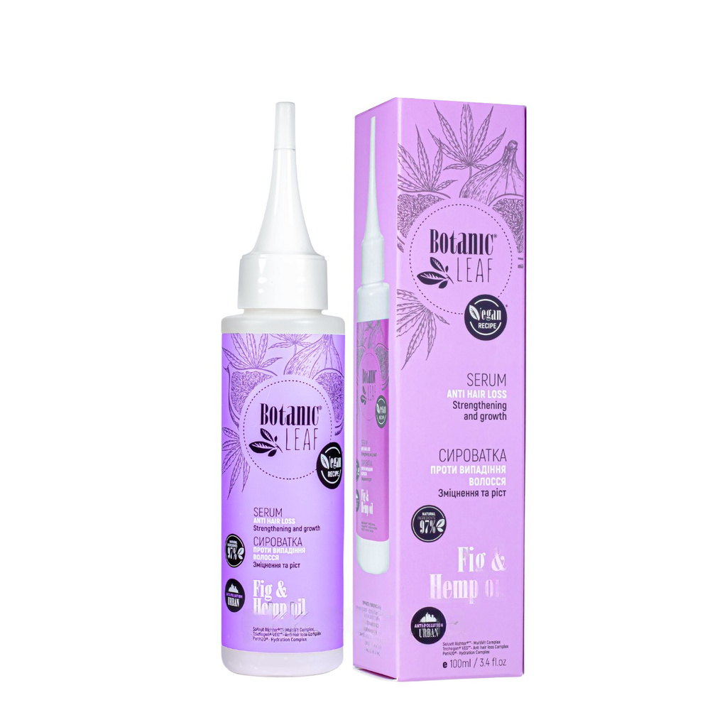 Незмивана сироватка проти випадіння волосся Зміцнення та ріст Сироватка Зміцнення та ріст Botanic Leaf розроблена для боротьби з випадінням волосся і допоможе вам зберегти його густоту та здоров'я. Стимулююча емульсія має багатовекторну дію на шкіру голови:зупиняє випадіння волосся; зміцнює волосяні фолікули та активує сплячі цибулини; активізує ріст волосся; покращує кровообіг у дермі; нормалізує роботу сальних залоз.Для складу зміцнювального флюїду вибрали компоненти, що укріплюють волосся від коренів до кінчиків та століттями використовуються у народній медицині:інжир — доглядає за шкірою голови завдяки вітамінам А і С; олія конопель — збільшує еластичність волосся, зволожує і полегшує розчісування, надаючи волоссю сяйво і натуральний блиск; олія реп'яха — живити корені волосся завдяки жирним кислотам, особливо рицинолевій, активізує ріст; відвар листя кропиви — зупиняє випадіння, змінює луки, прискорює ріст.Також у формулу додали амінокислоти, вітаміни, протеїни що мають зміцнювальну та відновлювальну дію. Сироватка проти втрати волосся містить 97% натуральних компонентів та не має у складі SLES, SLS. Засіб випускається у флаконі з кришечкою-дозатором, що дозволяє зручно та ощадно використовувати засіб.Спосіб використання сироватки проти випадіння волосся Botanic Leaf:Помийте волосся шампунем. Нанесіть сироватку на шкіру голови, обережно промастить. Не змивайте!Для більш ефективної дії застосовуйте разом з іншими продуктами лінійки — шампунем та спреєм.