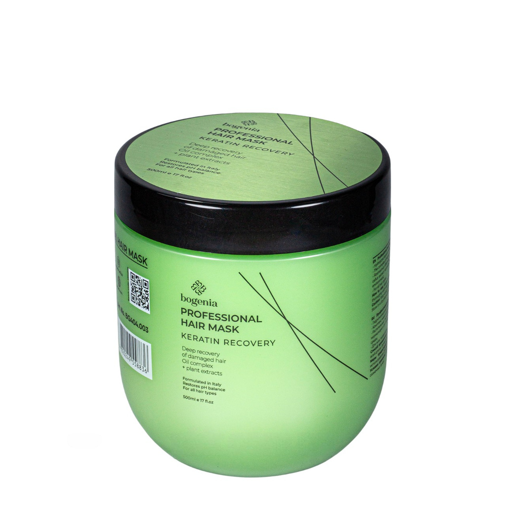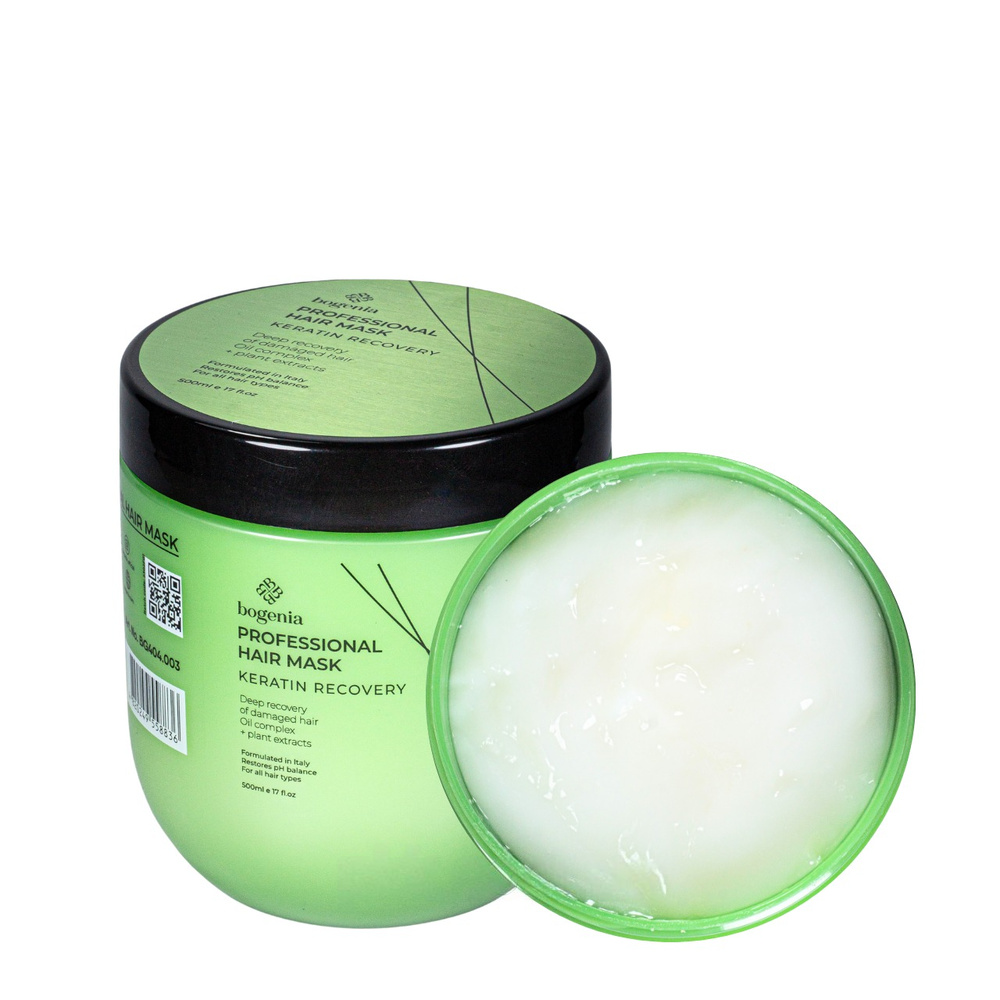 Професійна маска для відновлення волосся Bogenia Keratin Recovery з гідролізованим кератином та оліями жожоба та аргани Волосся пошкоджене через неправильний догляд, вплив сонця, солоної чи хлорованої води? Спробуйте професійну маску для відновлення волосся Bogenia з кератином, рослинними екстрактами та комплексом рослинних олій аргани та жожоба. Ця маска підходить для всіх типів волосся, а особливо — для сухого і ламкого. Ефект кератину для волосся у складі маски — глибоке відновлення тканини стрижня, зволоження, догляд за кінчиками волосся, створення захисної оболонки на поверхні волосин, яка захищає від дії зовнішнього середовища. Рослинна компонента маски для волосся включає рослинні екстракти розмарину, ромашки, алое та калюси соєвих бобів. Завдяки натуральним компонентам маска захищає ваші локони від негативного впливу навколишнього середовища, нормалізує кислотно-лужний баланс шкіри. У складі маски, що відновлює, для пошкодженого волосся присутні рослинні олії аргани і жожоба, які помітно оживлюють і живлять ваші пасма. Застосовуйте маску регулярно, і насолоджуйтесь здоровим волоссям. Щоб прискорити і посилити ефект, використовуйте разом з іншими засобами лінійки догляду за волоссям Bogenia - шампунь, зволожувальний кондиціонер і живильний бальзам.Спосіб застосування:Нанесіть маску Bogenia, що відновлює, на волосся після миття і рівномірно розподіліть по всій довжині. Залишіть на 5-10 хвилин, щоб рослинні екстракти, олії та кератин маски проникли вглиб волосся. Змийте теплою водою.Об'єм 500 мл