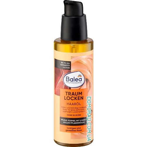 Олія для волосся Dream Curls від Balea Professional складається з потужної формули для помітного та видимого результату: природних жвавих локонів, повних блиску та пружності. Формула працює на основі 5 цінних рослинних олій: бабассу, арганової, кокосової, жожоба та соняшникової олії. Завдяки цій комбінації олія для волосся доглядає за кучерявим волоссям, надає йому природного блиску та пружності з ефектом запобігання кучерявості.