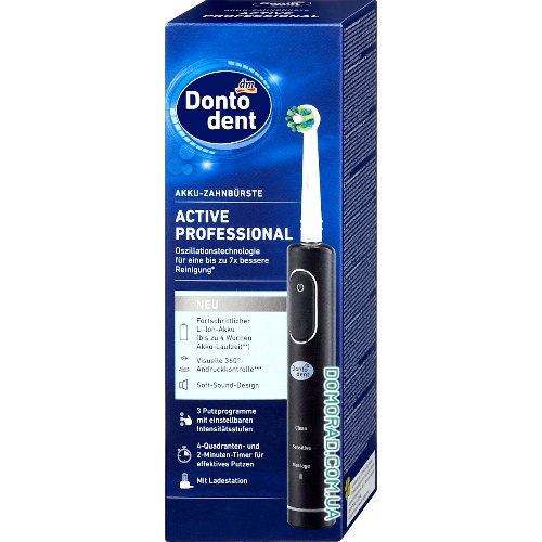 Бездротова зубна щітка Dontodent Active Professional Pure White/Graphite Blue забезпечує чудову ефективність очищення завдяки 3 режимам чищення, інтелектуальному датчику тиску, функції таймера та довговічній батареї. Головка щітки з частотою до 8800 коливальних рухів на хвилину забезпечує особливо інтенсивне очищення.