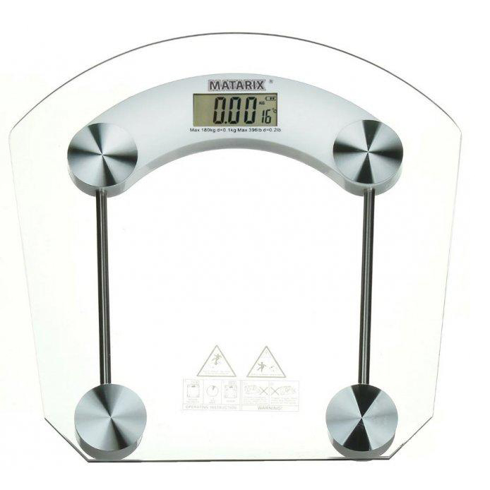 Ваги для підлоги електронні MATARIX MX 451B з платформою із загартованого скла. Ваги належать до електронного обладнання, вони живляться від невеликої батареї та мають функцію аналізу ваги. Точність вимірювання ваг допускає похибку 100 грам. Максимальне навантаження на ваги -180 кг.