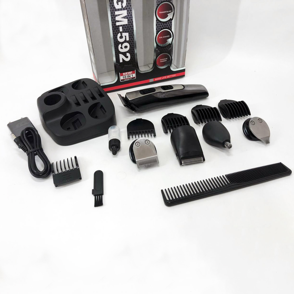 GEMEI GM-592 9 в 1 чудовий подарунок для сучасного чоловіка, який стежить за своєю зовнішністю та любить у всьому акуратність та організованість. На цільній підставці грамотно розташована сама машинка GEMEI GM-592 та супутні аксесуари. Кожна з наявних з десяти насадок у наборі має своє строге призначення, завдяки цьому комплекту чоловік може підтримувати в ідеальному стані свої вуса і бороду, регулювати довжину волосся, що зістригається, а також делікатно позбавлятися зайвого волосся в носі і вухах.