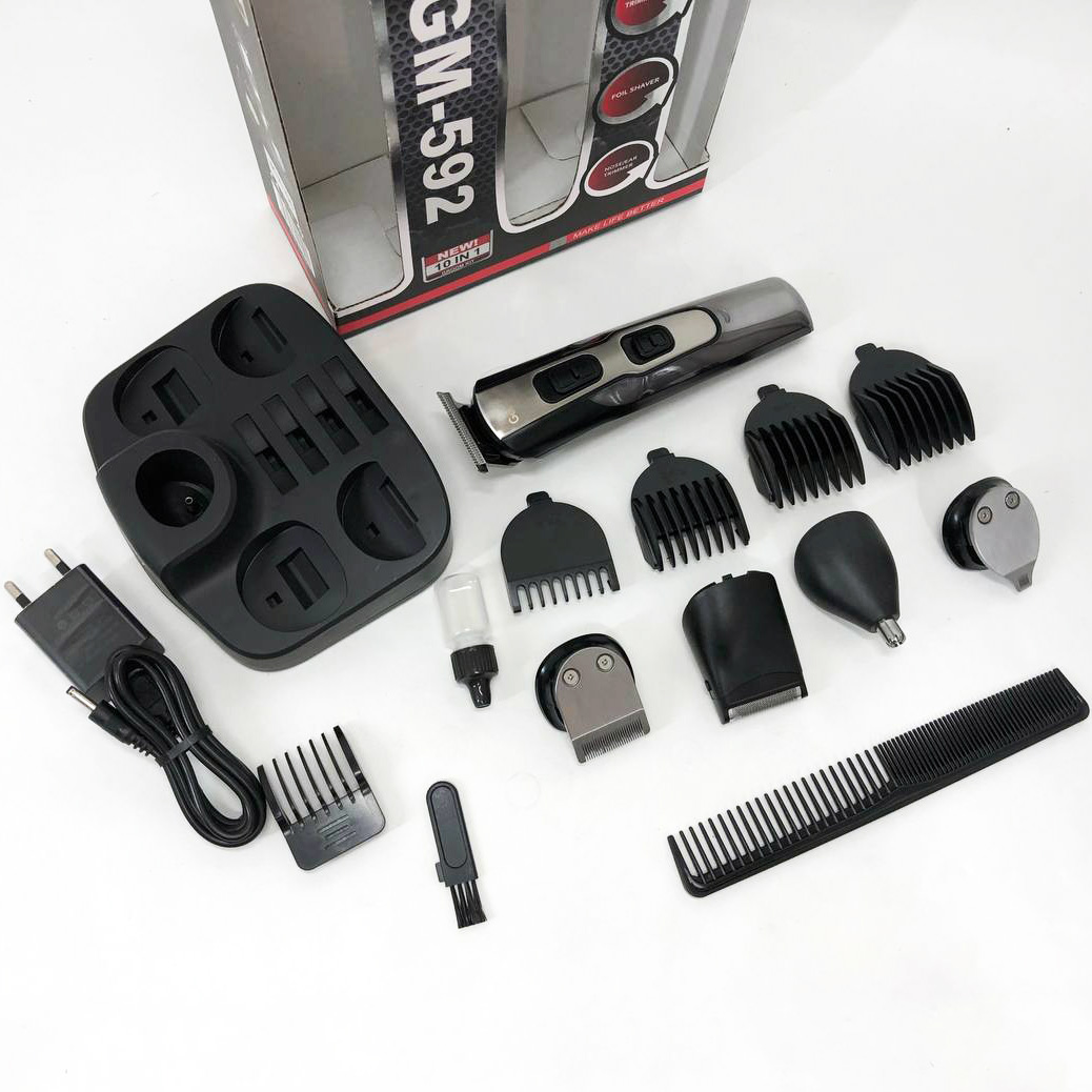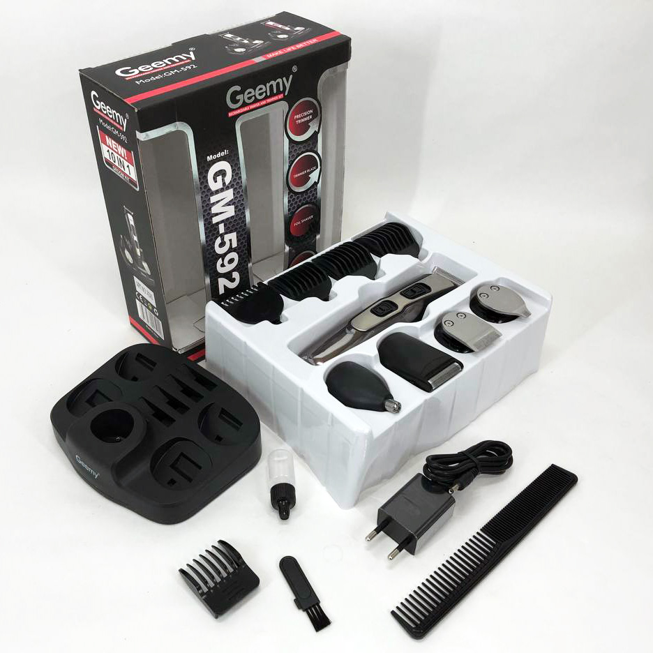 GEMEI GM-592 9 в 1 розроблена спеціально для комплексного догляду за чоловічою зовнішністю. Пристрій дозволяє регулювати довжину волосся на голові і бороді з максимальною точністю завдяки різноманітним насадкам. Крім того, машинка ефективно видаляє волосся з важкодоступних місць, таких як ніс і вуха, забезпечуючи гігієнічність та охайний вигляд. Підставка з організацією зберігання аксесуарів допомагає завжди мати всі необхідні інструменти під рукою, економить час і підтримує порядок. Такий набір стане ідеальним рішенням для самостійного використання вдома або як змістовне доповнення до подарунка для сучасного чоловіка.