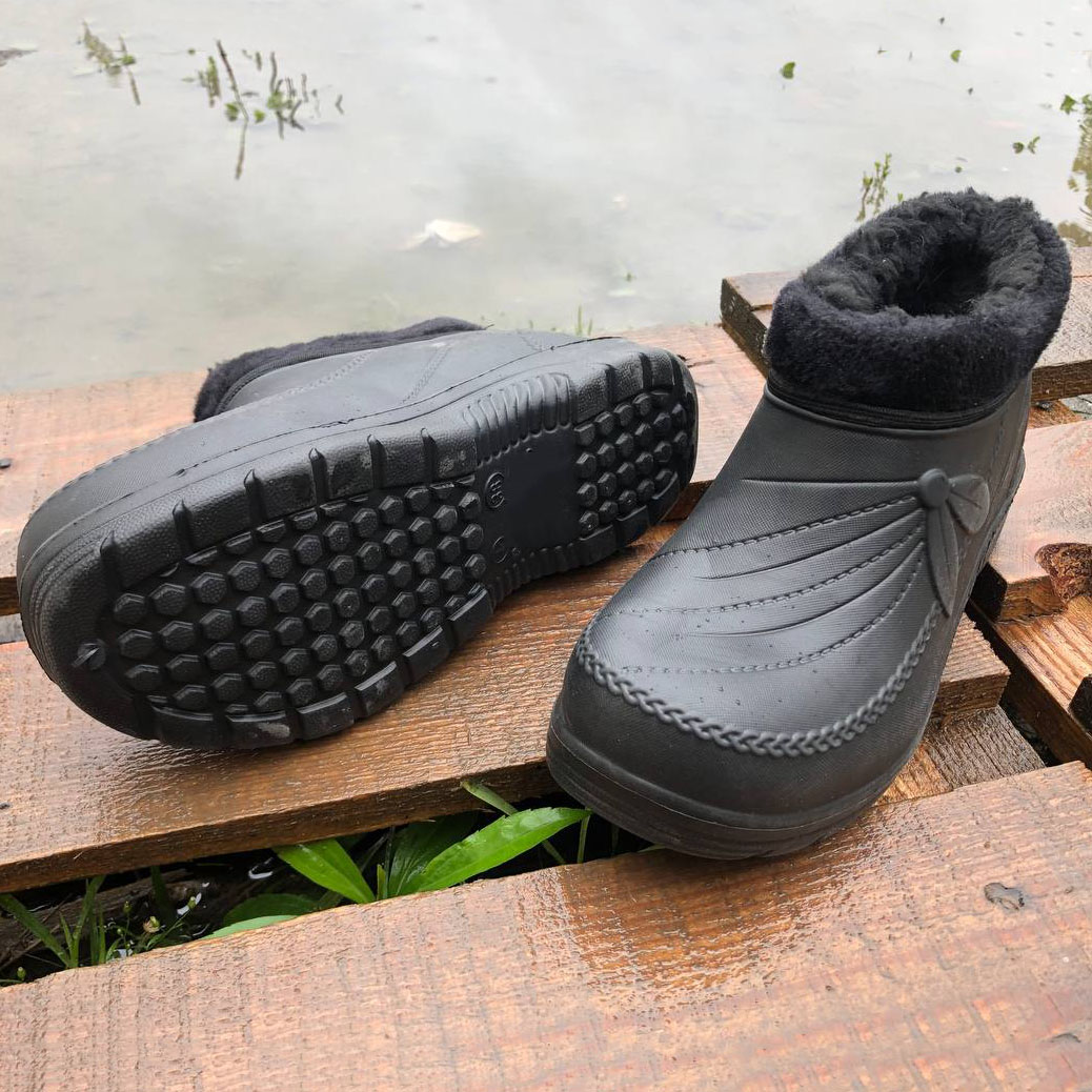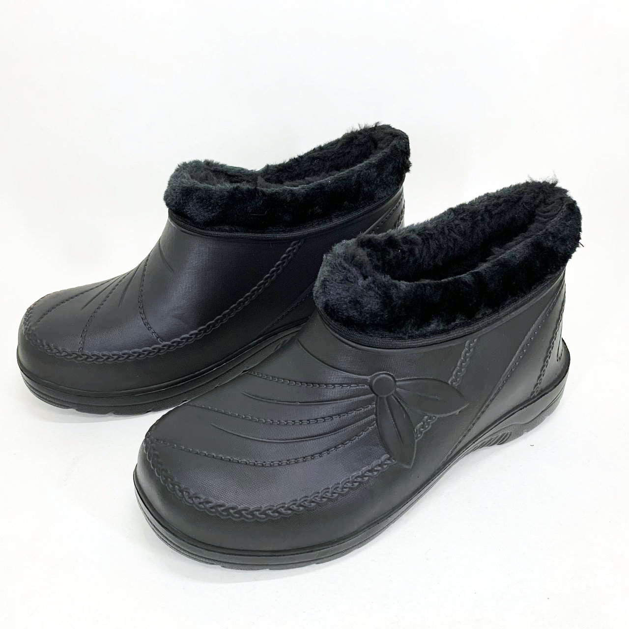 Стильний рельєфний декор з боків у вигляді тиснення надає взуттю витонченого вигляду, підкреслюючи жіночність образу. Темний колір залишається практичним у повсякденному використанні, а м’який край з хутром додає затишку. Гнучка підошва з протиковзким малюнком дозволяє впевнено почуватися навіть на слизькій поверхні.