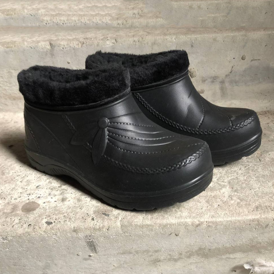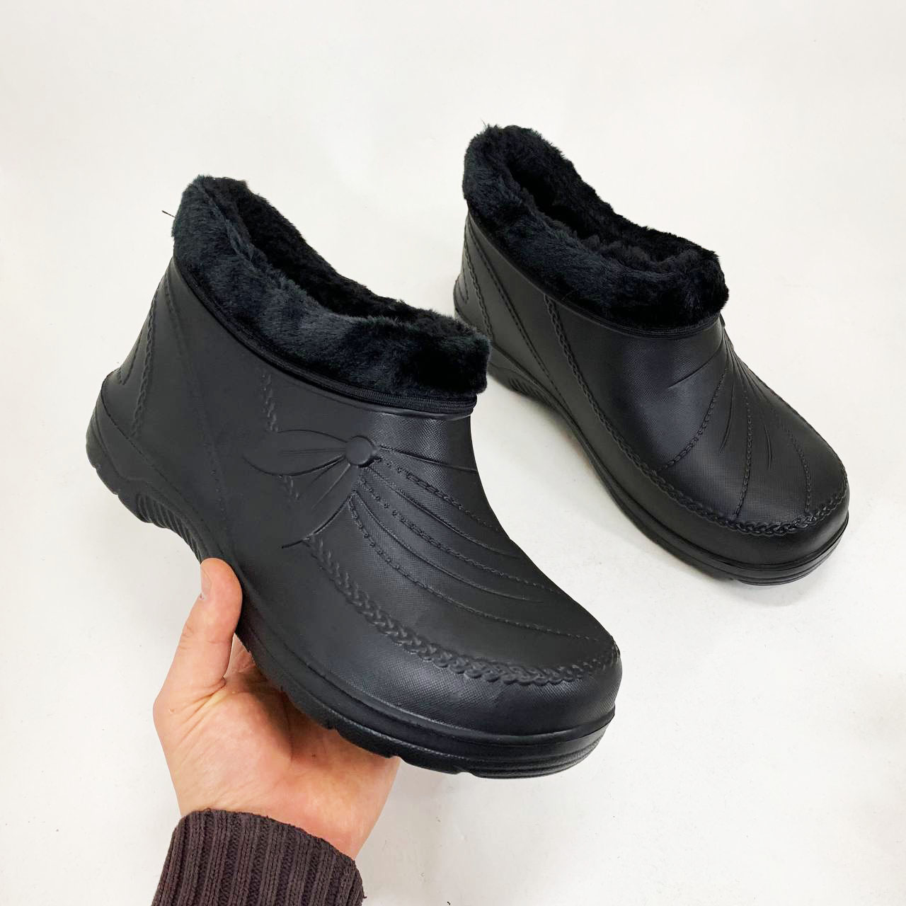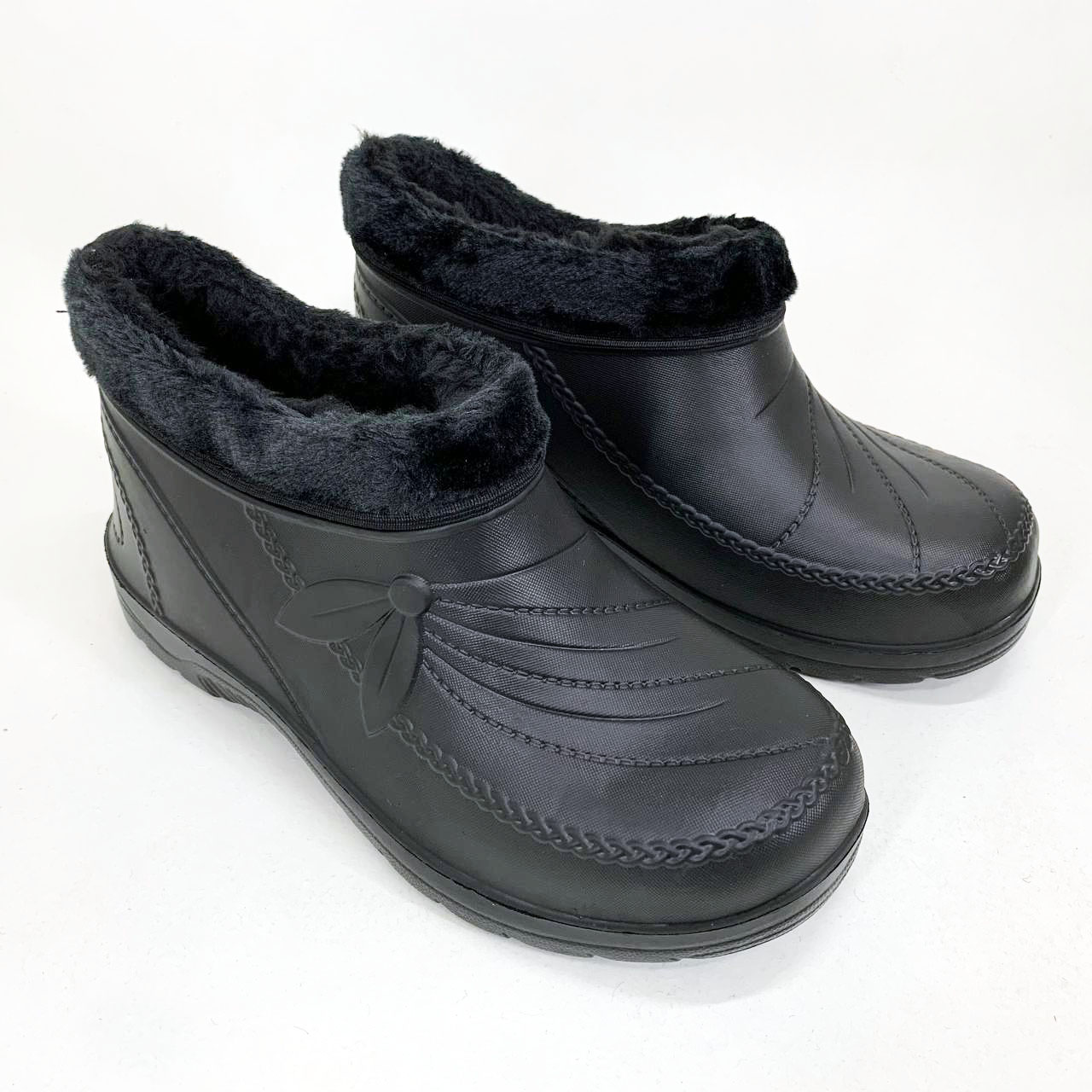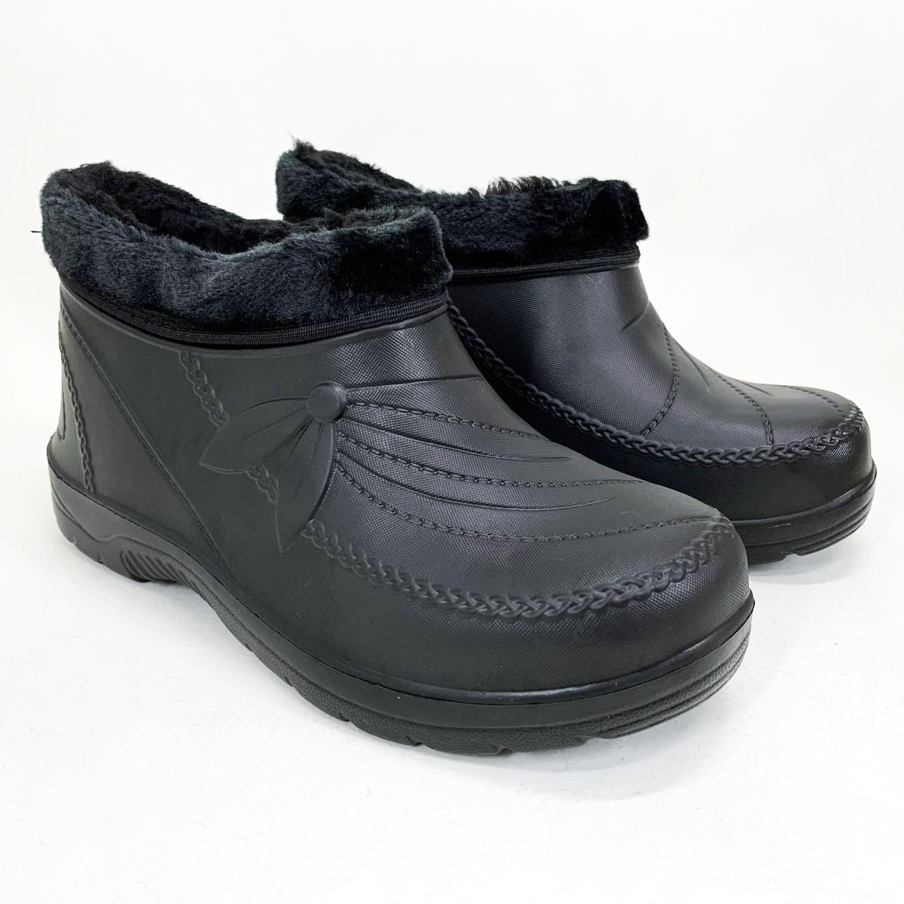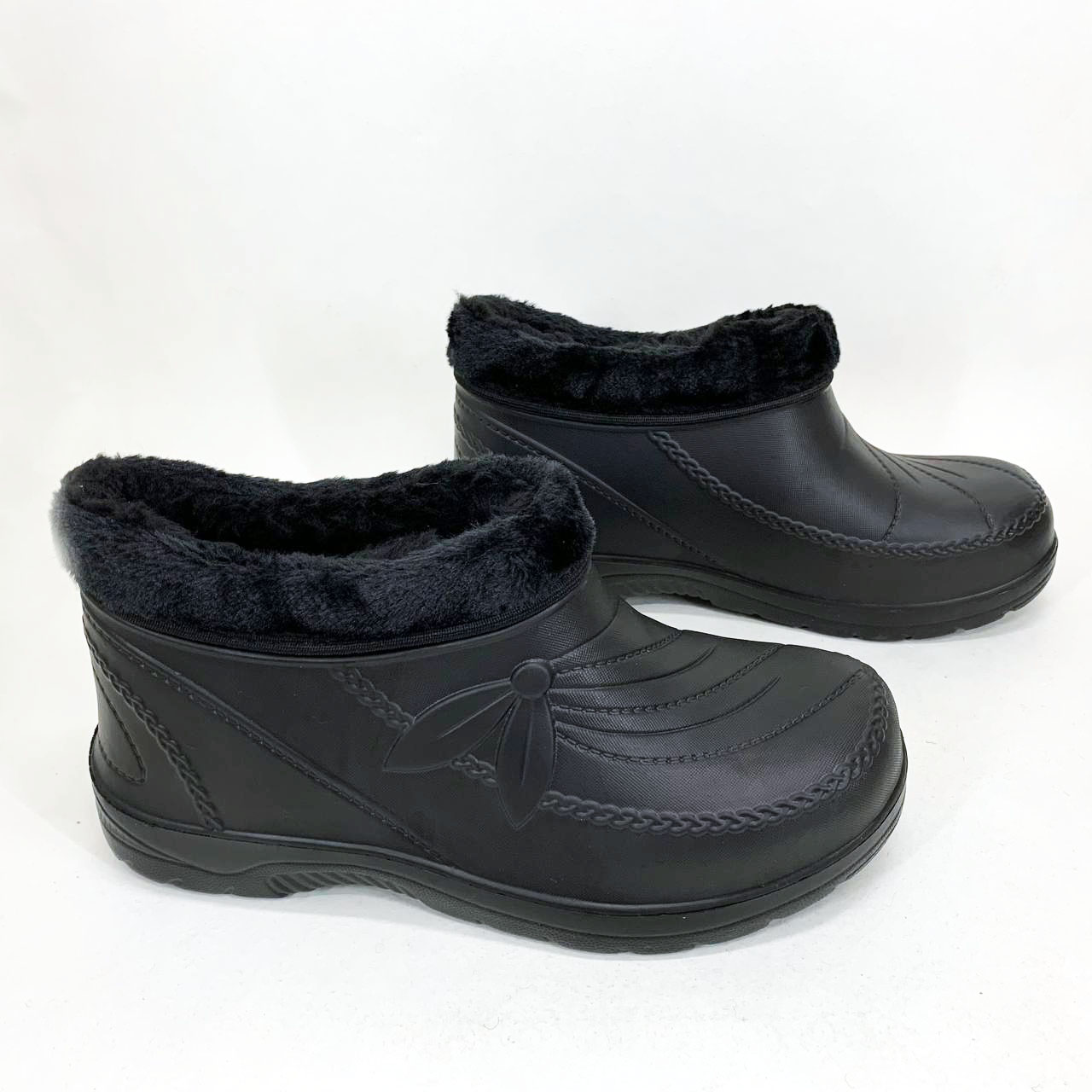 Стильний рельєфний декор з боків у вигляді тиснення надає взуттю витонченого вигляду, підкреслюючи жіночність образу. Темний колір залишається практичним у повсякденному використанні, а м’який край з хутром додає затишку. Гнучка підошва з протиковзким малюнком дозволяє впевнено почуватися навіть на слизькій поверхні.