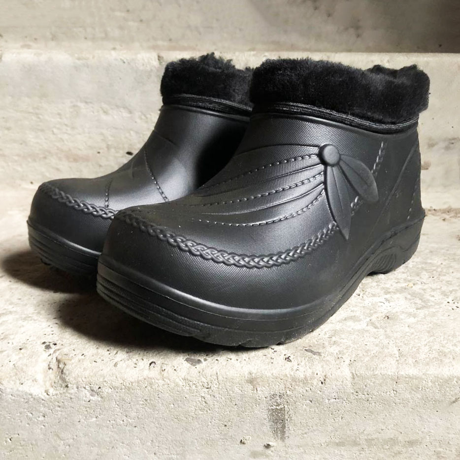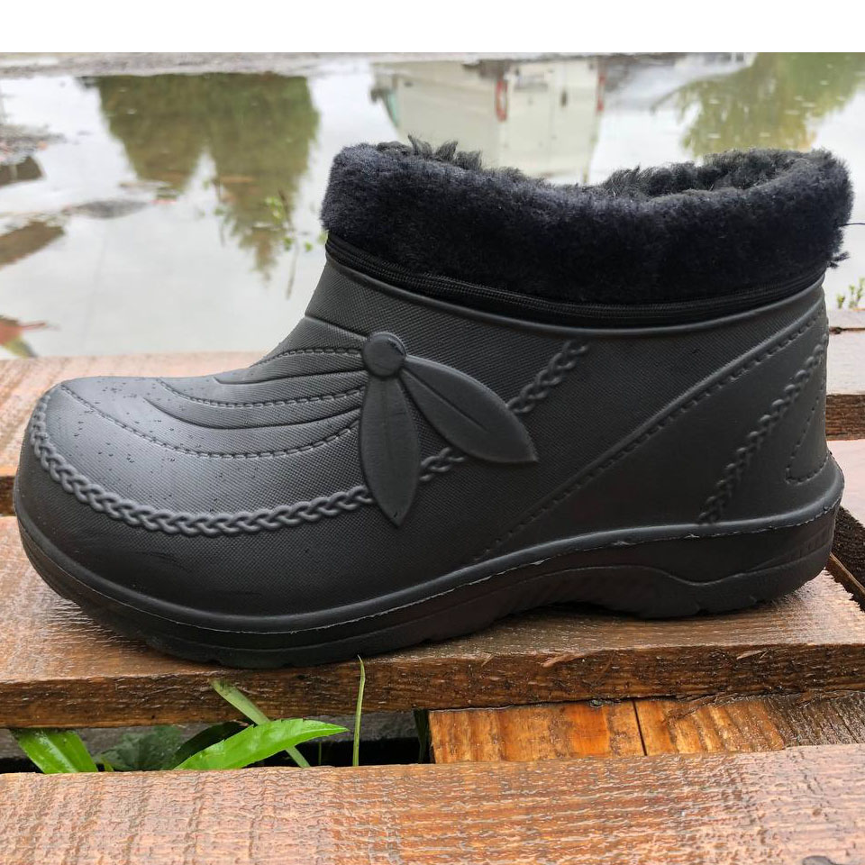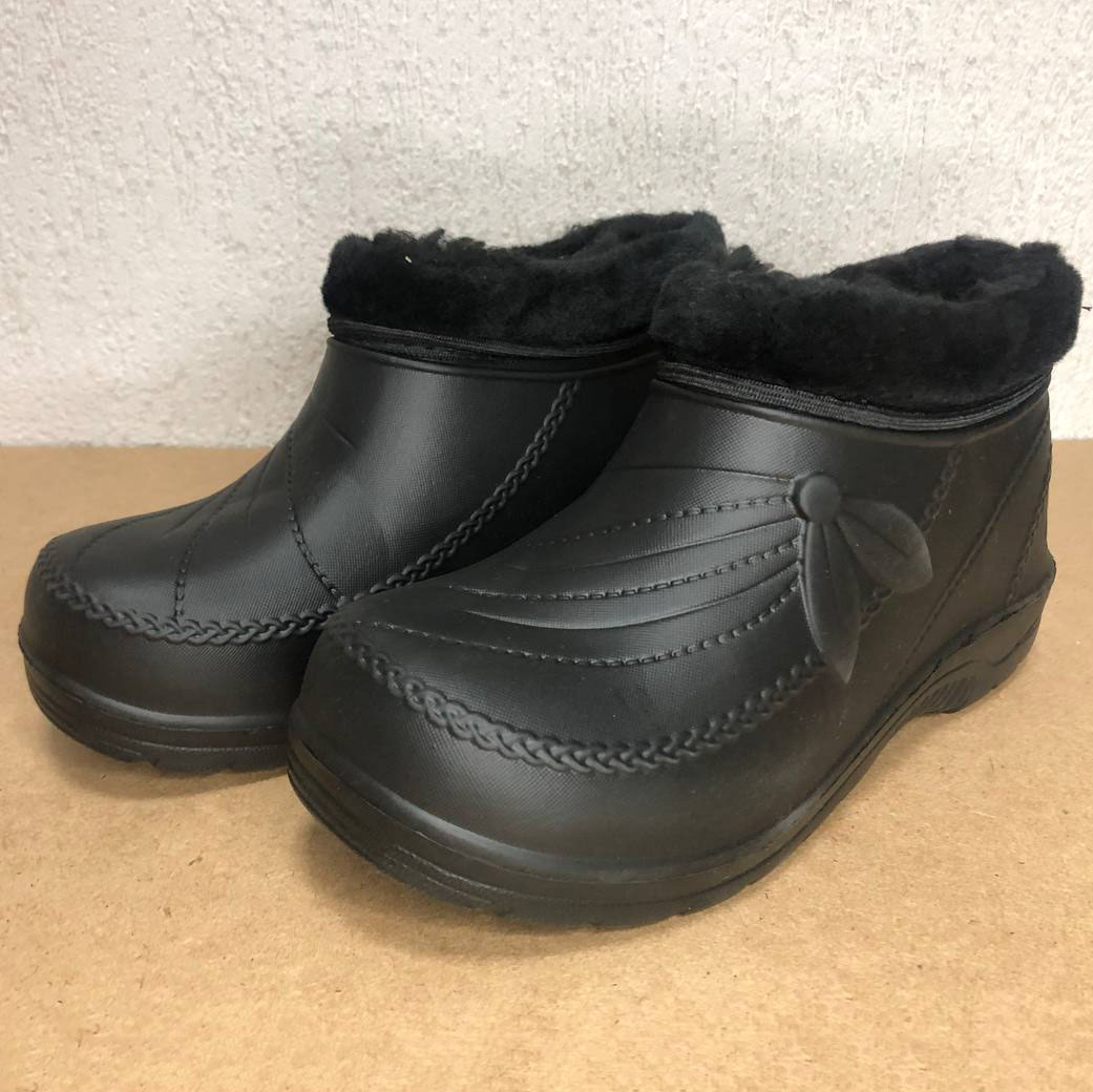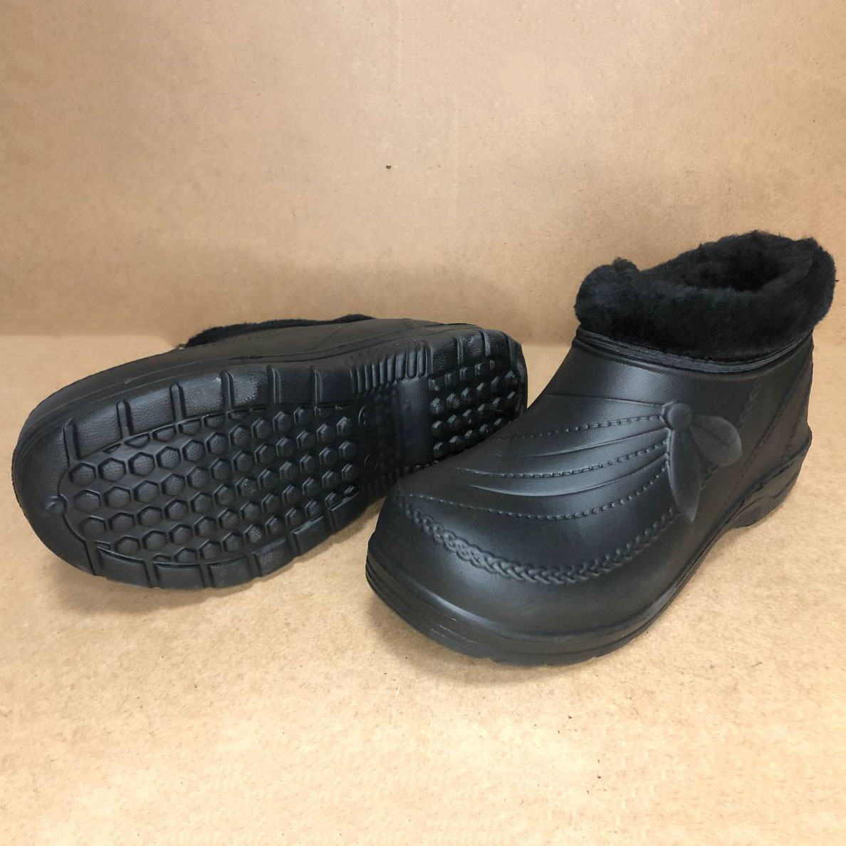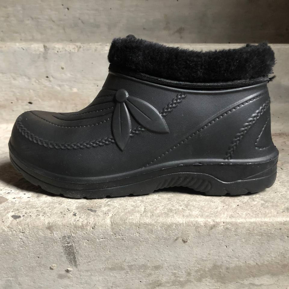 Стильний рельєфний декор з боків у вигляді тиснення надає взуттю витонченого вигляду, підкреслюючи жіночність образу. Темний колір залишається практичним у повсякденному використанні, а м’який край з хутром додає затишку. Гнучка підошва з протиковзким малюнком дозволяє впевнено почуватися навіть на слизькій поверхні.