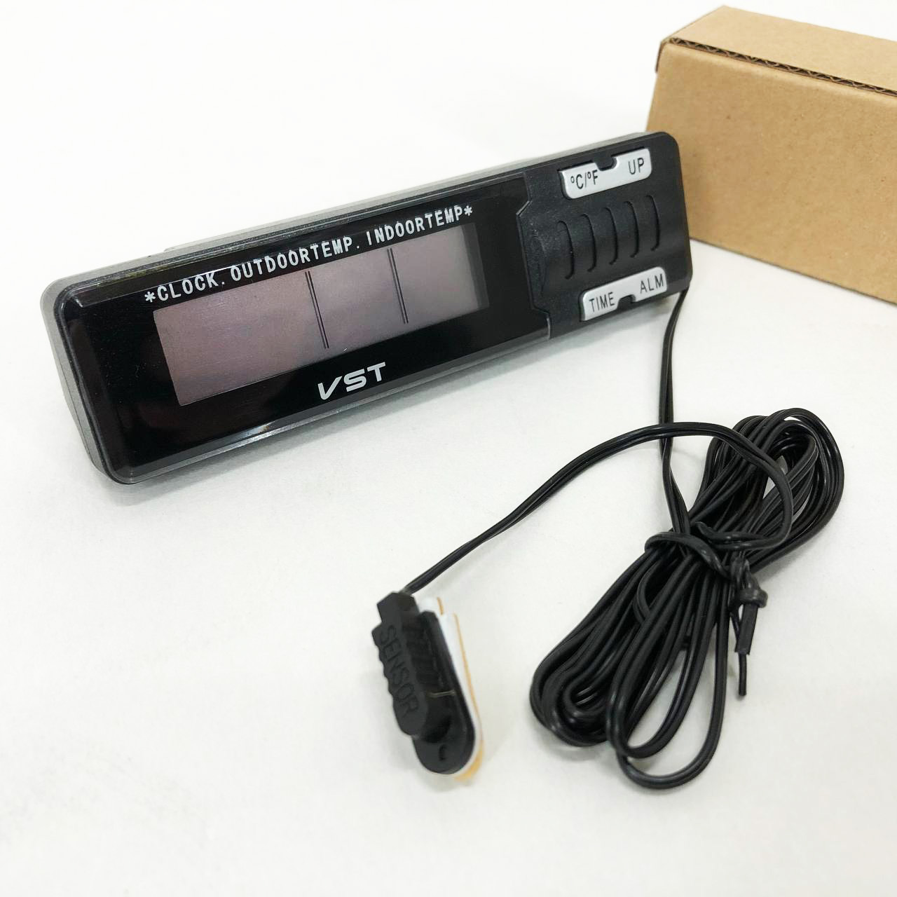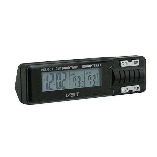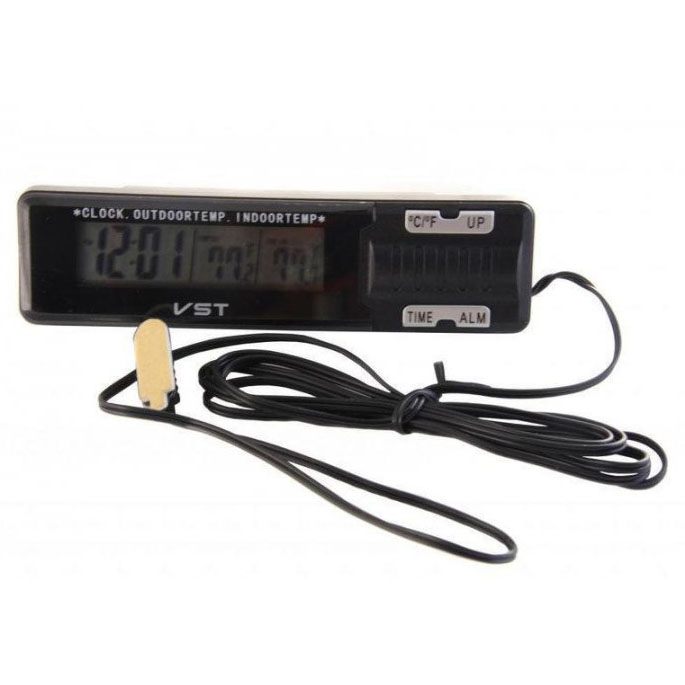 Електронний градусник показує температуру всередині приміщення та зовні, а також час. Прилад ідеально підходить для використання у автомобілях.