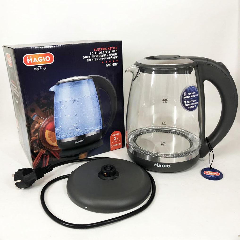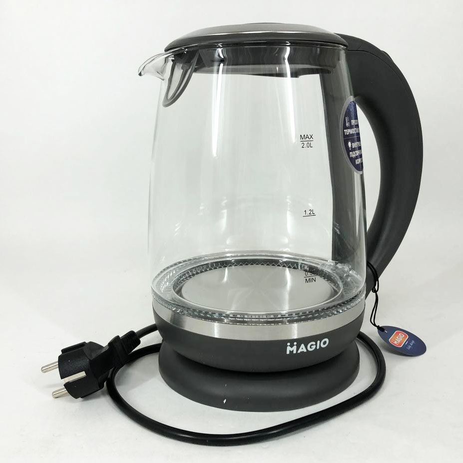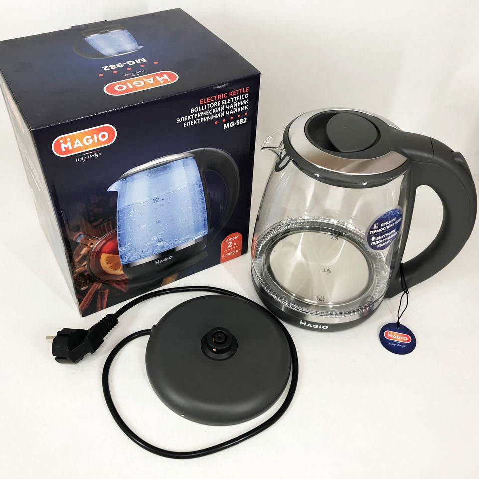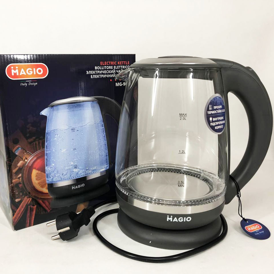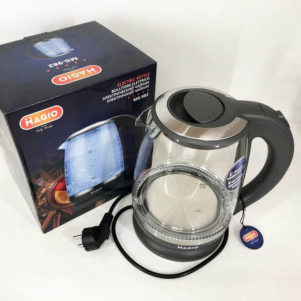 Електрочайник Magio MG-982 об’ємом 2 л розроблений для того, щоб приготувати чашку чаю в одну мить! Корпус виготовлений з прозорого термостійкого скла, завдяки чому у воді просто ні звідки з’явитися неприємним присмакам або навіть небезпечним для здоров’я речовинам. Чайник оснащений підсвічуванням, яке ефектно загоряється під час кип’ятіння води і автоматично вимикається при закінченні процесу.