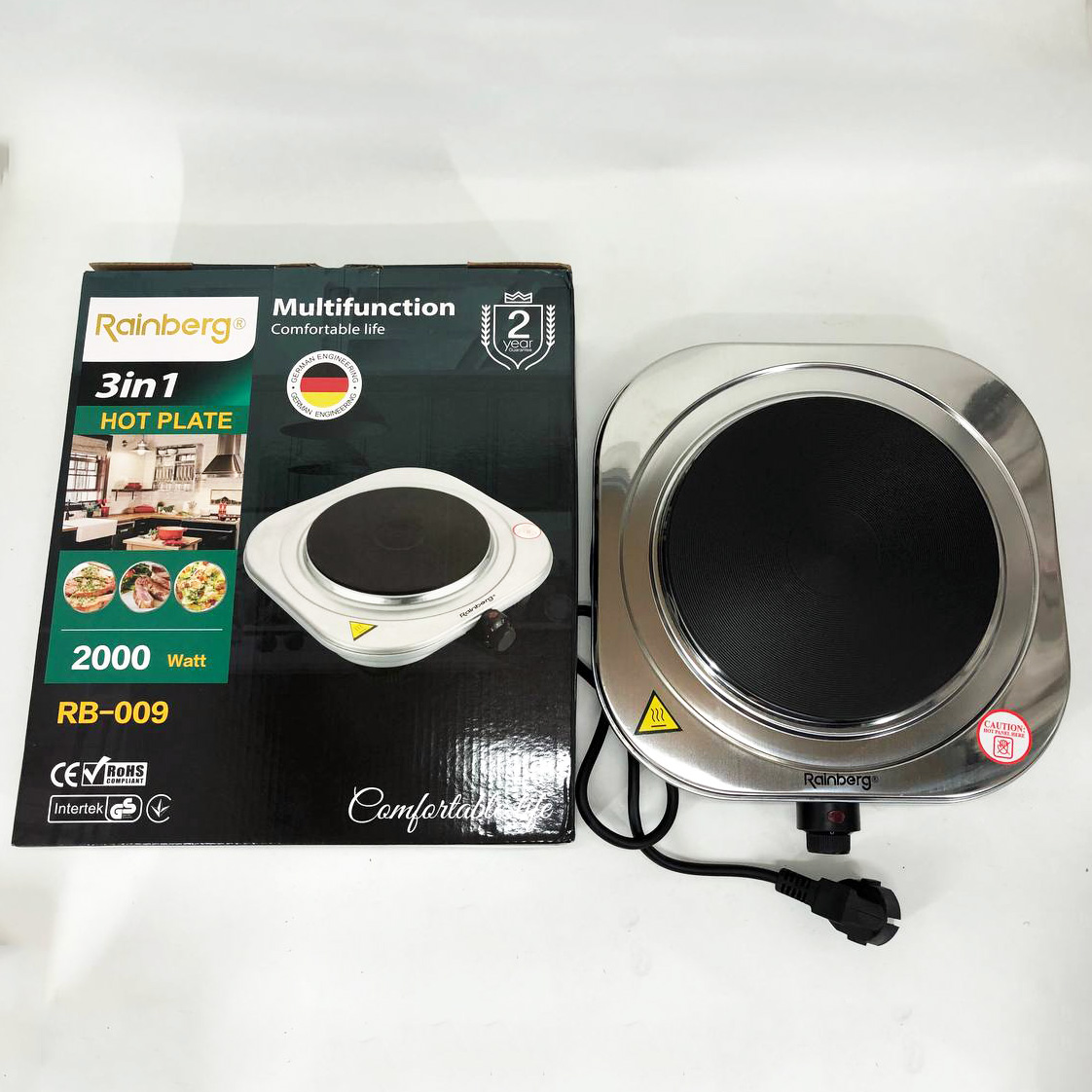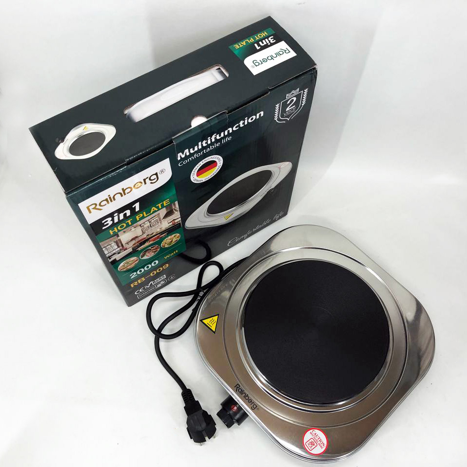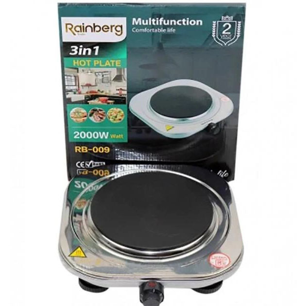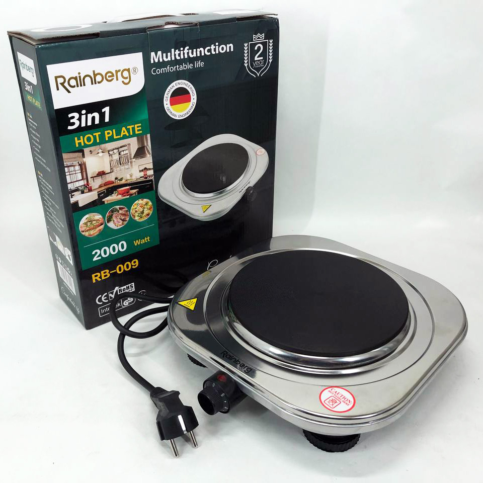 Електроплита одноконфоркова Rainberg RB-009 2000Ват. 27*30см дискова нержавіюча сталь. Електроплита Rainberg RB-009 це економний та малогабаритний пристрій, оснащений одним малопотужним чавунним нагрівачем, потужністю 2000Вт. із регульованим термостатом. Покриття робочої поверхні з нержавіючої сталі. Якщо у вас небагато місця на кухні, то RB-009 стане незамінним помічником на вашій кухні або будь-якому іншому місці. А завдяки легкій вазі її можна взяти з собою на дачу. Живлення від мережі 220В. Порадуйте корисними та смачними стравами своїх рідних та близьких, тепер на вашій кухні стане більше вільного місця.
