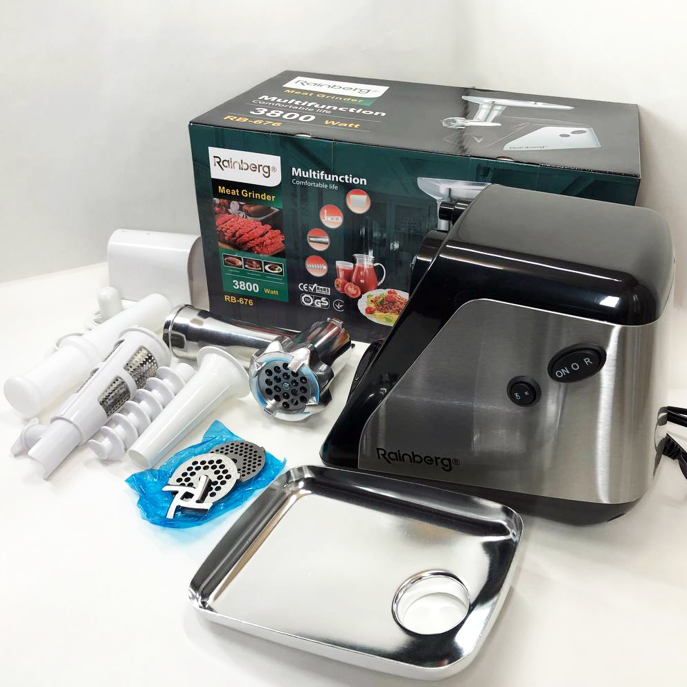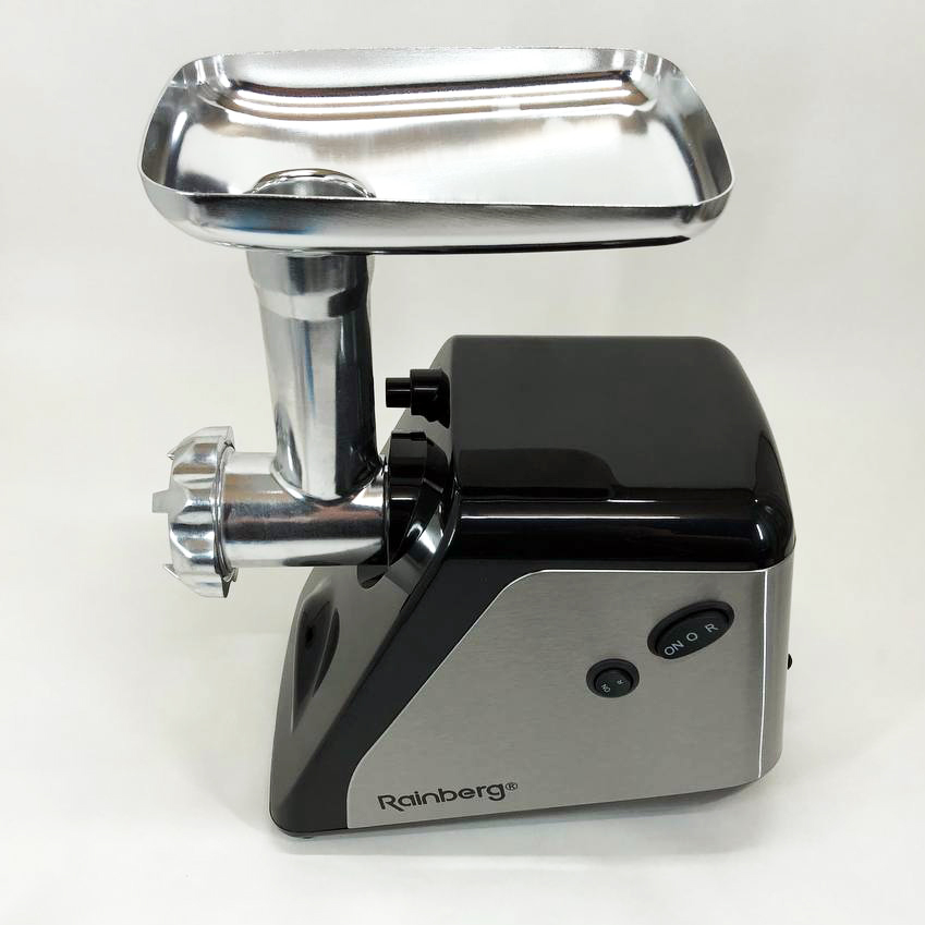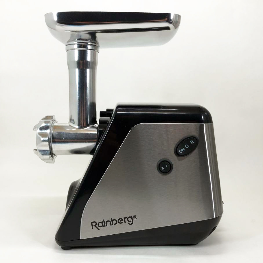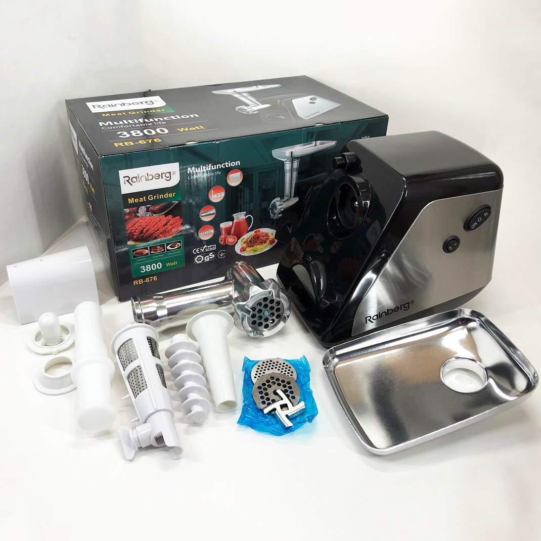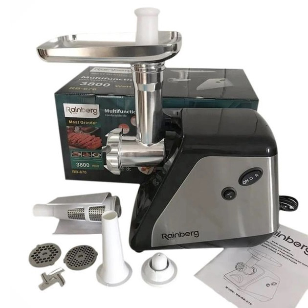 Електрична м’ясорубка Rainberg RB-676 | 3800W призначена для виготовлення фаршу з м’яса, риби, грибів, нарізки овочів та фруктів. Електро-м’ясорубка шнекового типу має функцію реверс, зворотне обертання ножів, що запобігає ущільненню продуктів усередині м’ясорубки та забезпечує якісне подрібнення.