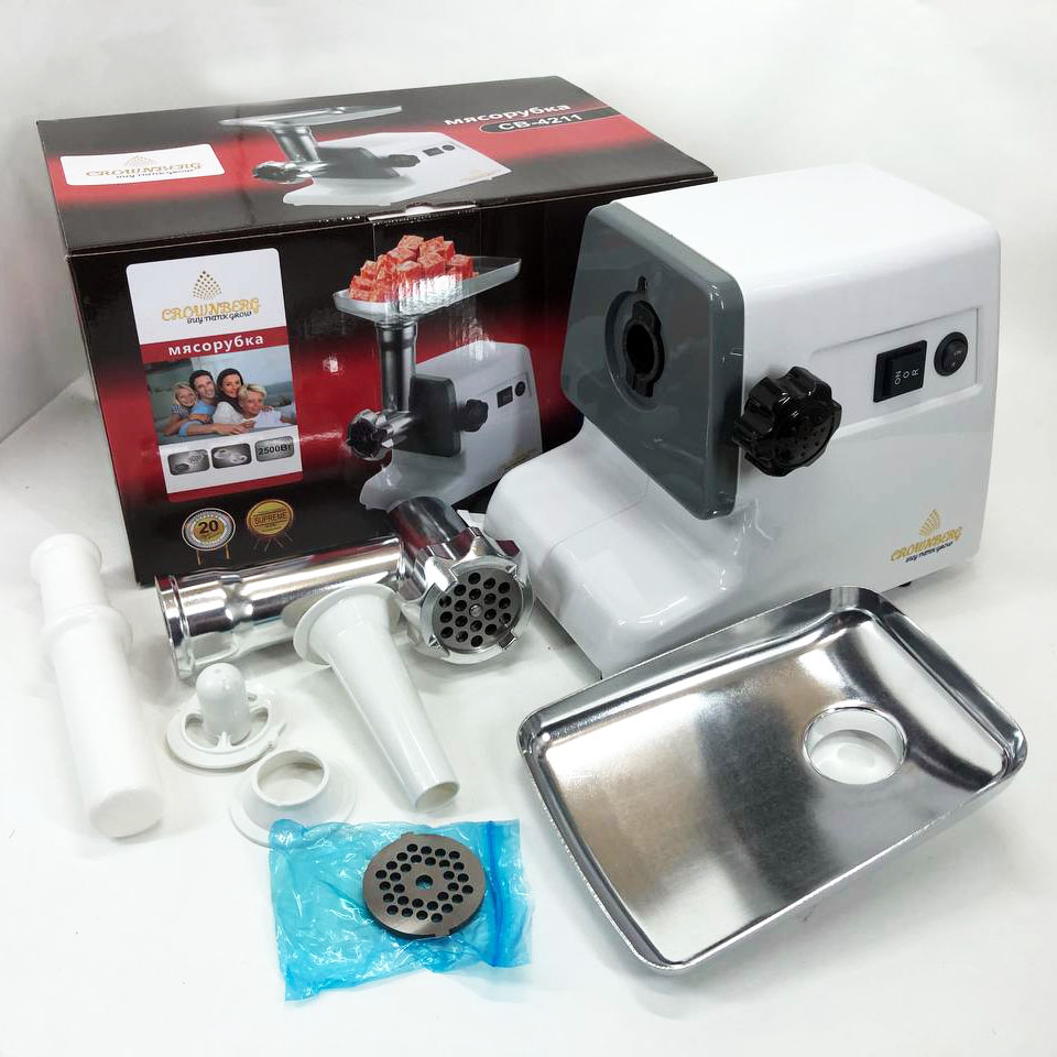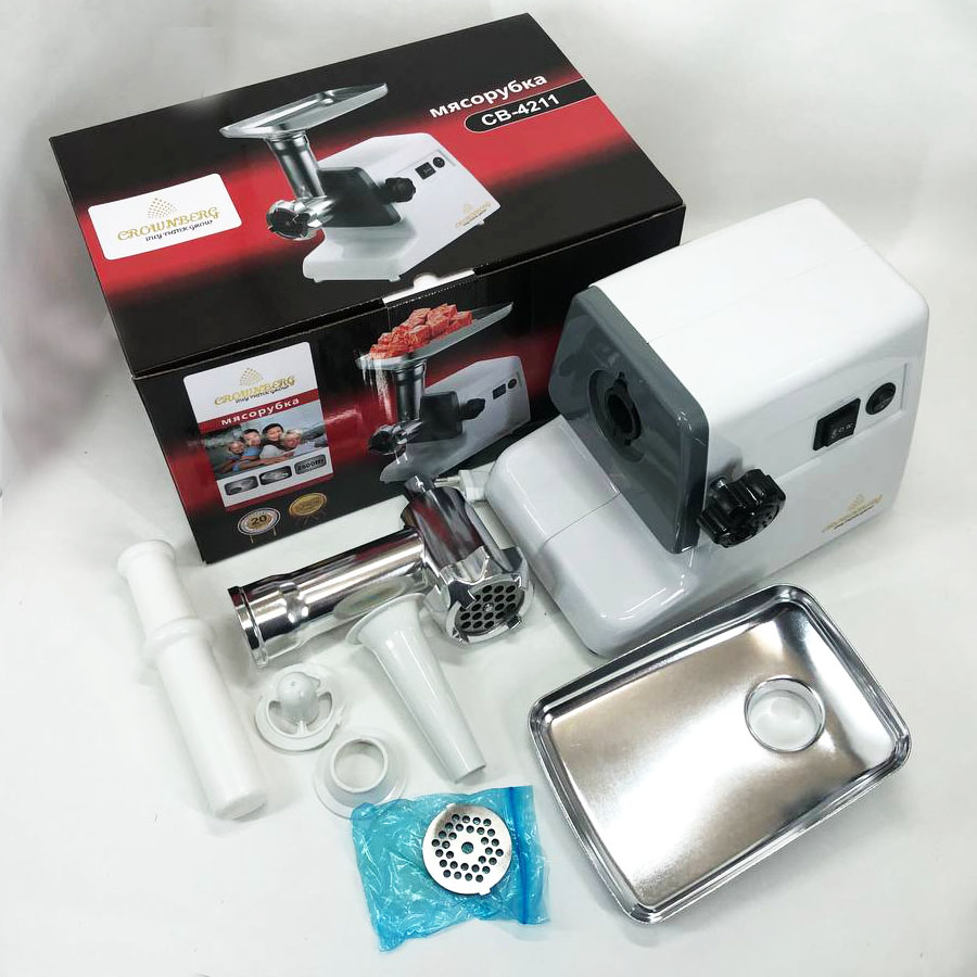 М’ясорубка Crownberg CB 4211 — це якісна м’ясорубка виготовлена з якісного пластику з гострими ножами з нержавіючої сталі. На нижній частині м’ясорубки встановлені якісні гумові ніжки для уникнення ковзання. Прилад оснащений двигуном 2500 Вт із захистом від перевантаження.