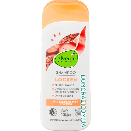 Шампунь для локонів органічне насіння льону, органічний виноград від alverde NATURKOSMETIK м’яко очищає, зменшує завивку та надає волоссю еластичність завдяки рецептурі з органічним насінням льону та органічним екстрактом винограду. Він особливо підходить для кучерявого, неслухняного волосся та гарантує доглянуті, чіткі локони, повні пружності.