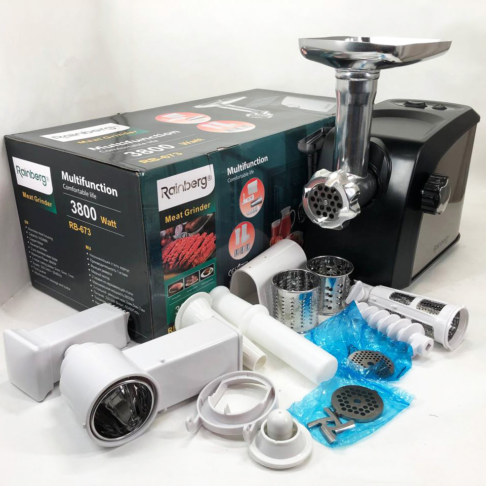 Електрична м'ясорубка Rainberg RB-673 із соковижималкою та шатківницею 9 насадок 3000W з реверсом
