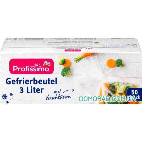3-літрові пакети для заморозки від Profissimo, виготовлені з міцної 3-шарової плівки, ідеально підходять для заморожування м’яса, приготованих страв і багатьох інших речей, що робить їх ідеальним супутником на кухні: включаючи практичні закриття.