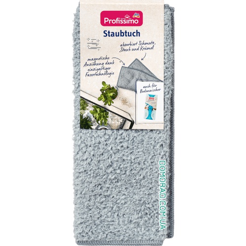 Пилопоглинаюча серветка Profissimo як ніколи раніше вбирає пил і може використовуватися і як ганчірка для пилу, і як ганчірка для підлоги. Підходить для сухого або вологого прибирання. Ганчірка — справжній брудоуловлювач, який завдяки спеціальній технології волокон вловлює багато пилу, крихт і волосся та без особливих зусиль видаляє плями. Серветка ідеально підходить для очищення від пилу електроприладів, меблів та автомобільної панелі.