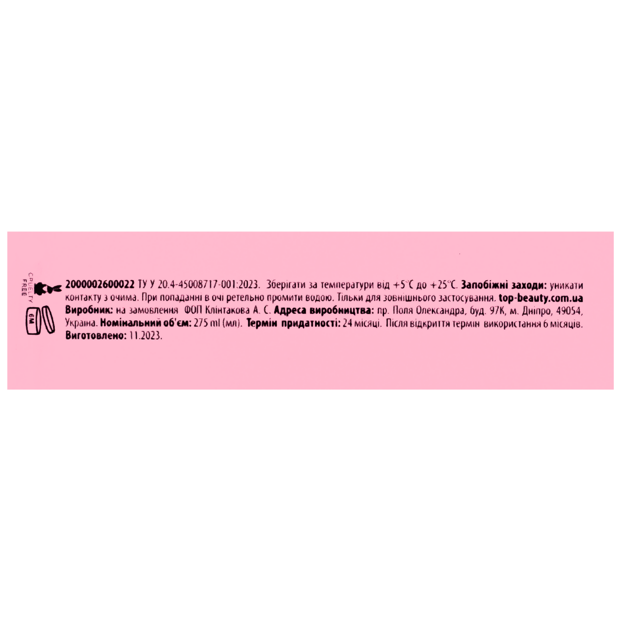 Парфумований гель для душу Top Beauty Cherry & Almond з екстрактами пшениці, алое віра та олією кокосаTop Beauty Cherry & Almond – це ексклюзивний парфумований гель для душу, який перетворить процедуру прийняття душу на справжню насолоду. Його унікальна формула поєднує в собі властивості вишуканого парфуму та засоби для догляду за шкірою.Багата та делікатна формула гелю розроблена спеціально для дбайливого очищення та догляду за вашою шкірою:протеїни пшениці - допомагають зберігати вологу, дарують шкірі м'якість та гладкість;