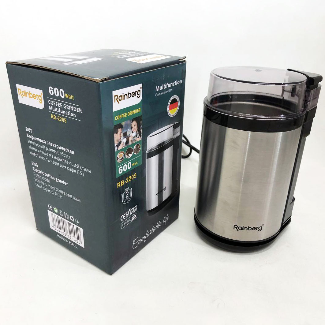 Компактна електрична кавомолка RB-2205, не займе багато місця на кухні і чудово підійде до будь-якого інтер’єру. Гострий сталевий ніж впорається з подрібненням кавових зерен за лічені хвилини і дозволить приготувати смачний і напій, що бадьорить, відразу на двох людей. Прилад має прозору кришку, що дозволяє повністю контролювати процес приготування. Працює від електромережі 220 вольт. Потужна побутова кавомолка для кави Rainberg RB-2205