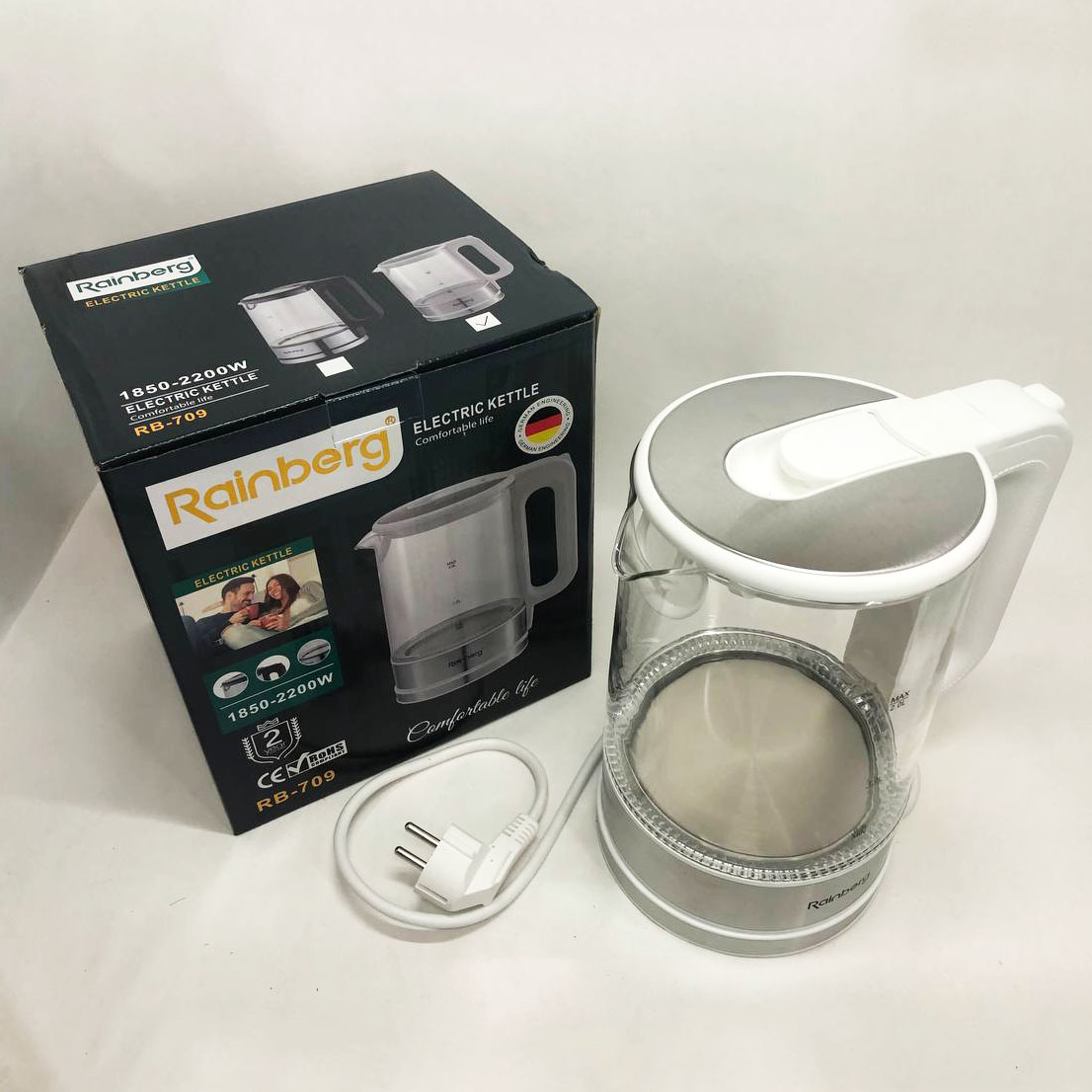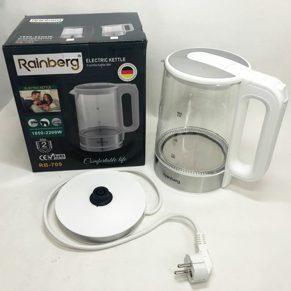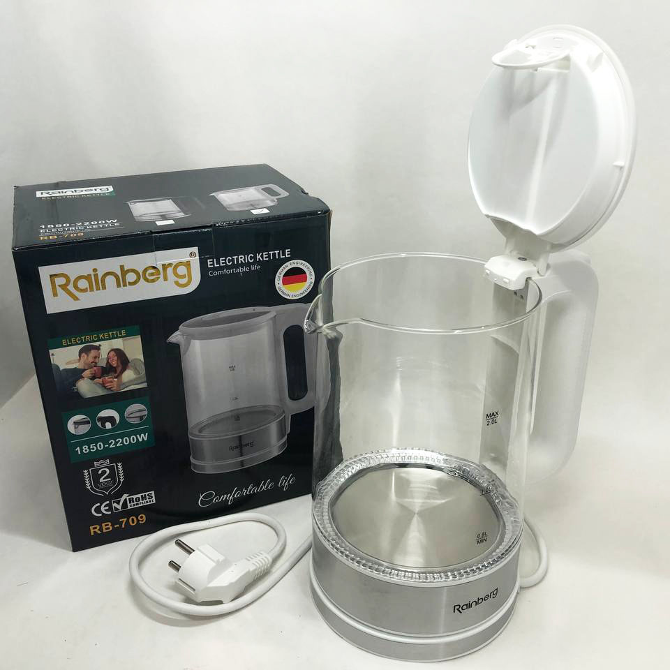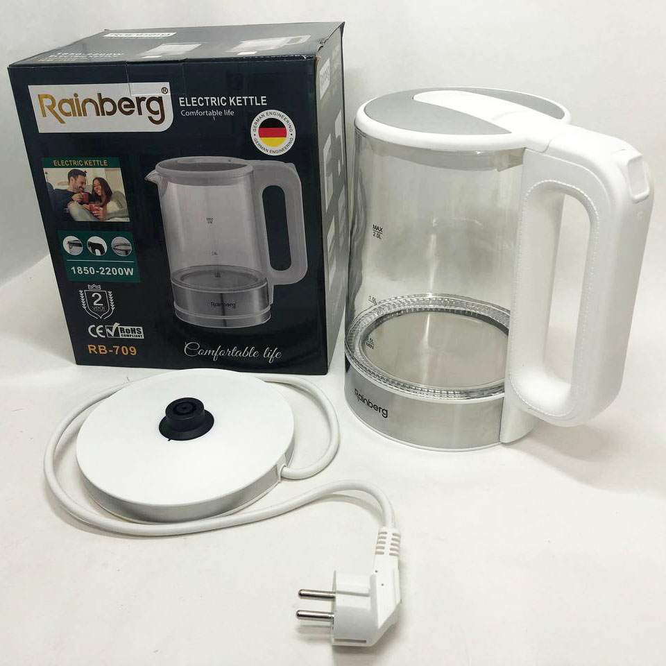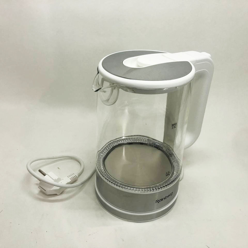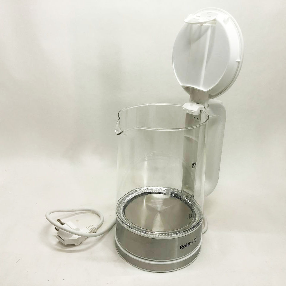 Дисковий електричний чайник Rainberg RB-709 скляний з підсвічуванням, чайник електро. Колір: білий