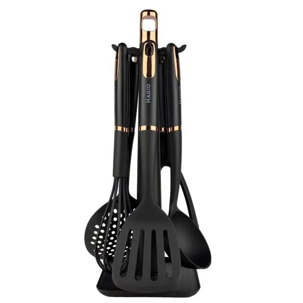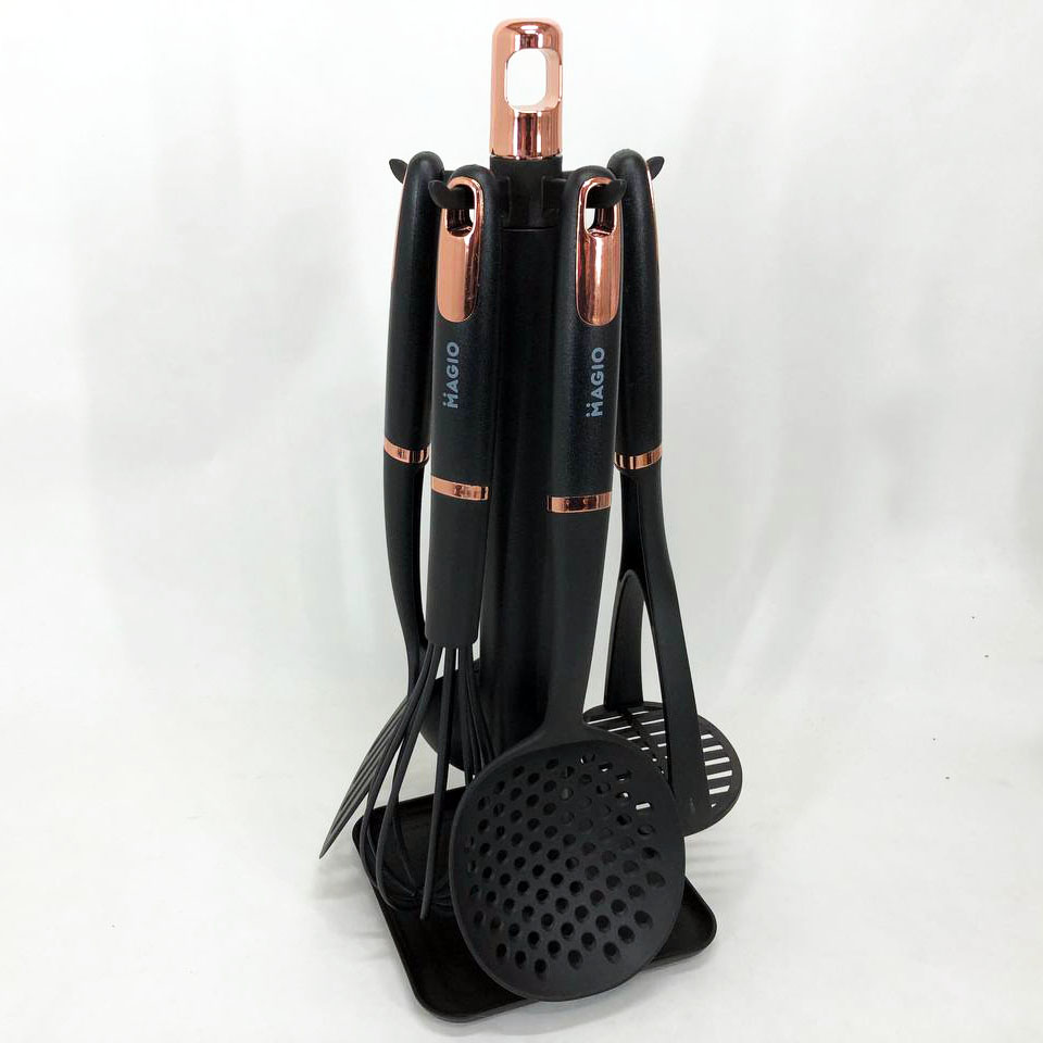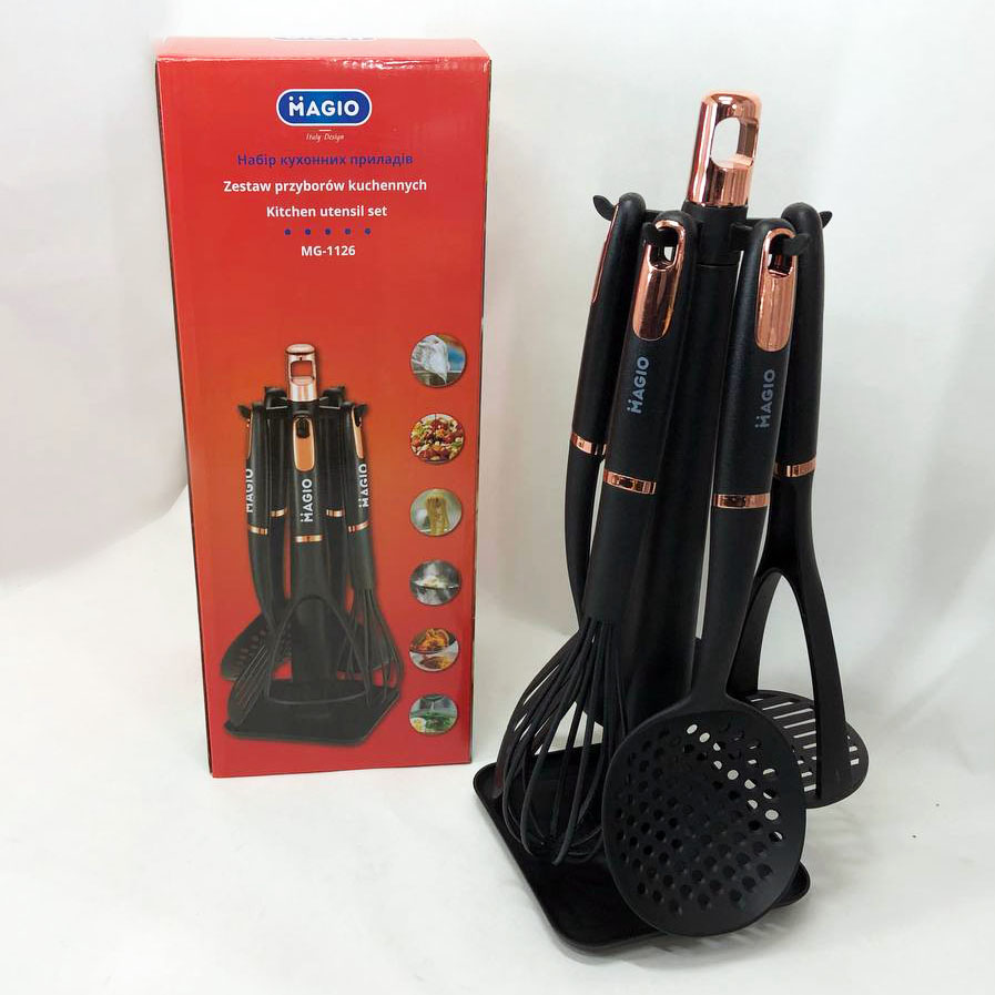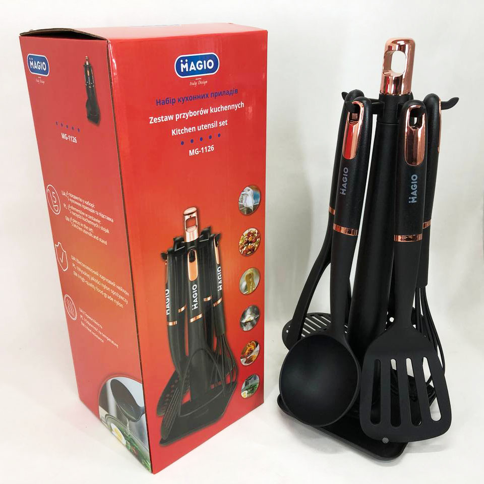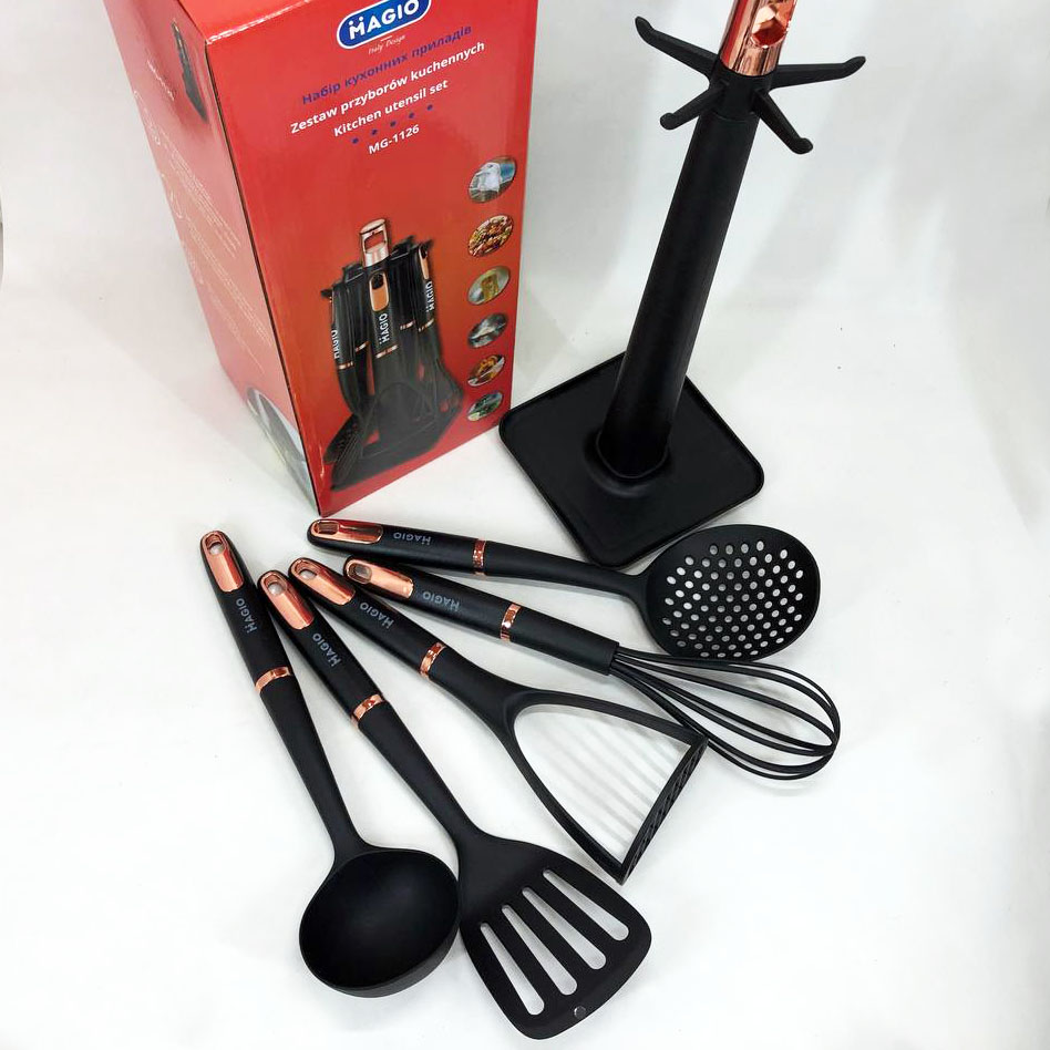 Набір кухонний MG-1126 — практичне приладдя з пластику та нейлону. Ідеально підходить для всіх ваших повсякденних кулінарних потреб. Завдяки підставці можна легко зберігати їх на кухонній стільниці.