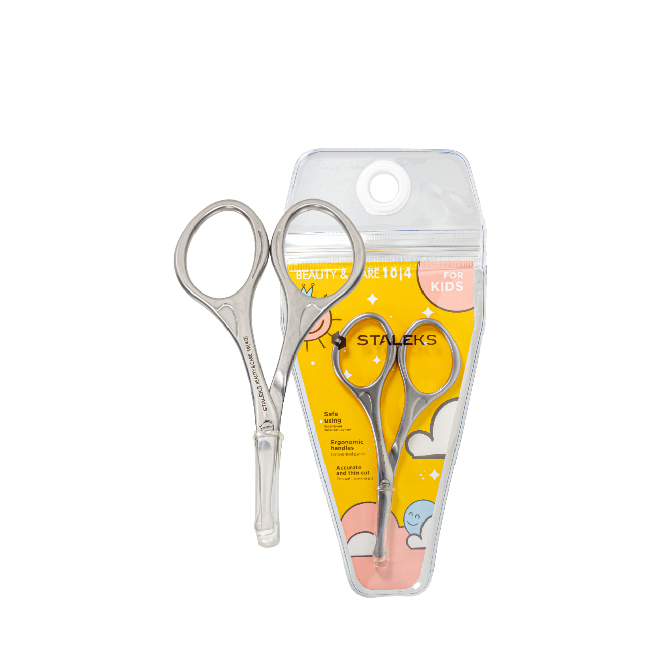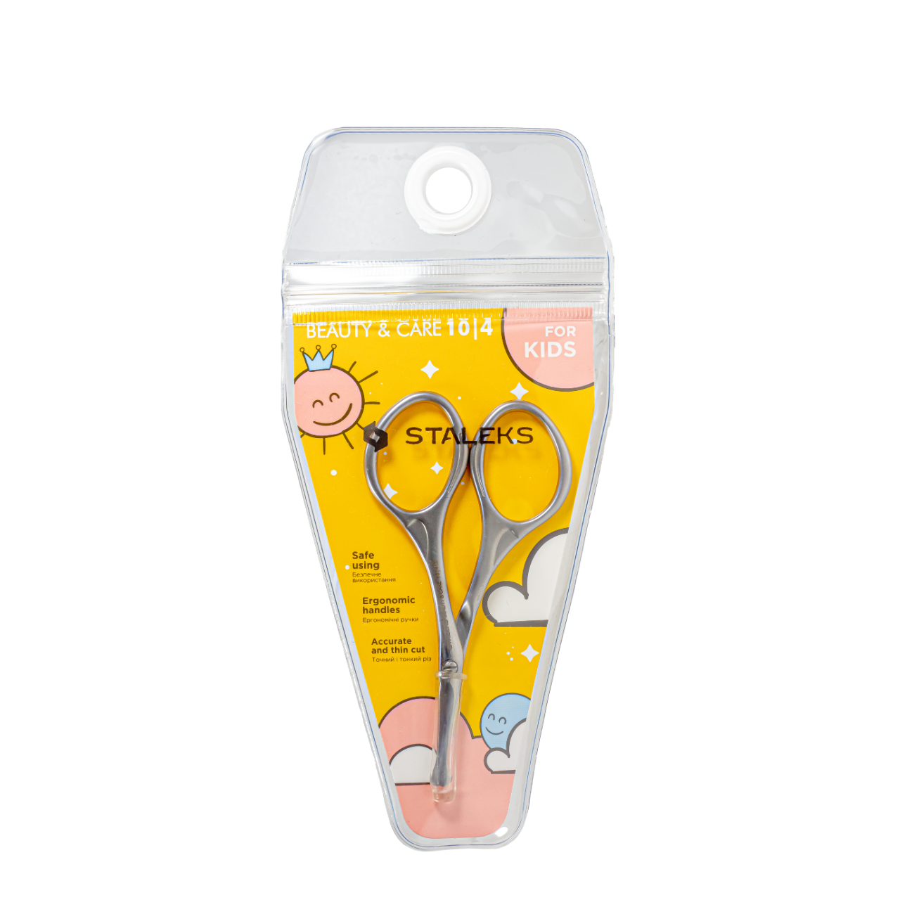 Ножиці для дитячого манікюру безпечні Staleks Beauty & Care 21 мм SBC -10/4Ножиці для нігтів STALEKS BEAUTY & CARE 10 TYPE 4 призначені для підрізування нігтів у дітей. Закруглені кінці та вигнута форма лез із нержавіючої медичної сталі забезпечують безпеку навіть при манікюрних процедурах у дуже маленьких дітей.Манікюрний аксесуар дозволяє легко та делікатно зрізати нігтики з тонких дитячих пальців, без пошкодження нігтьової пластини та шкіри. Леза дитячих манікюрних ножиць мають ручне заточування, що продовжує їх термін служби без додаткового заточування.Ергономічні ручки мають матове покриття для найкращої фіксації інструменту для манікюру в руці. Особливості ножиць для нігтів дитячих матових BEAUTY & CARE 10 TYPE 4:закруглені кінчики лез; вигнута форма; ручне заточування; ергономічна ручка із матовим покриттям; стійкість до стерилізації в сухожарі та автоклаві; кільця стандартного розміру з матовим покриттям.Спосіб застосування: Перед зрізанням нігтів дитині продезінфікуйте дитячі матові ножиці BEAUTY & CARE 10 TYPE 4. Видаліть кутикулу з поверхні нігтя, обережно відсунувши її до основи пушером. Акуратно підріжте нігті дитини ножицями для нігтів. Трохи підпилюйте краї нігтів шліфувальною пилкою. Очистьте інструмент, просушіть та сховай у чохол до наступного застосування.Розміри: довжина ножиць для дітей – 90 мм, довжина лез – 21 мм, ширина лез – 4 мм;