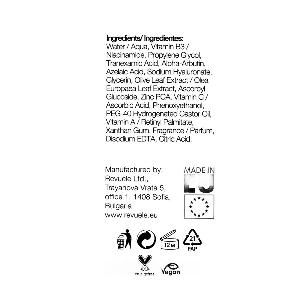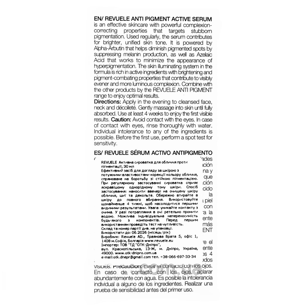 Відбілююча сироватка від пігментних плям Revuele Anti Pigment Active Serum з альфа-арбутином, гіалуроновою кислотою, вітамінами А, ССироватка для обличчя освітлює пігментні плями, допомагає отримати світліший і рівний тон шкіри. Активні компоненти сироватки, що відбілює:альфа-арбутин - пригнічує вироблення меланіну;