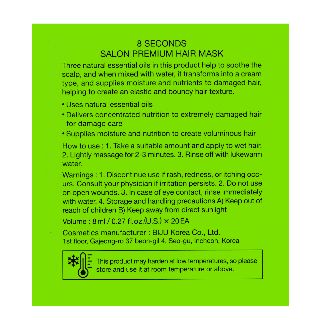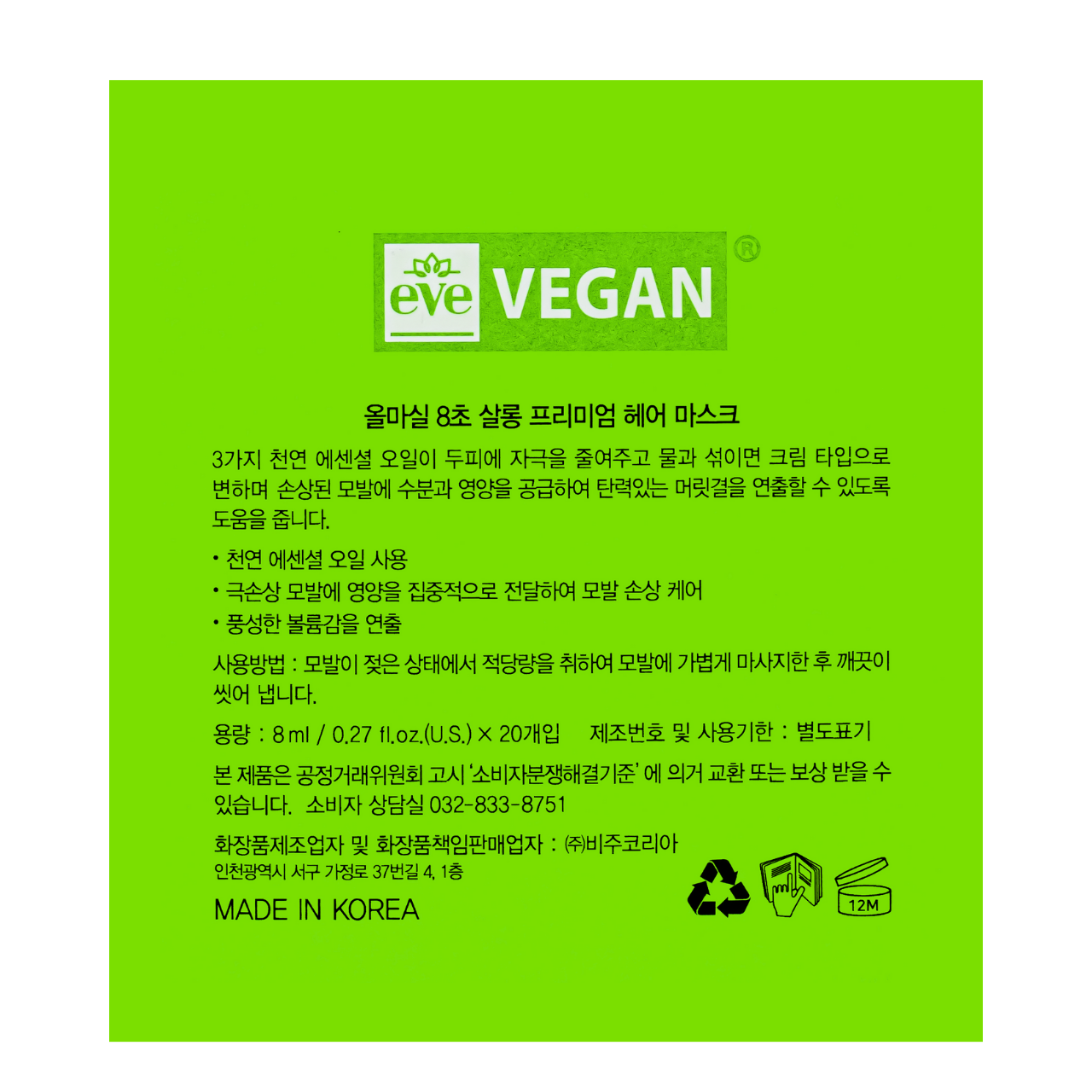 All Masil 8 Seconds Salon Premium Hair Mask Vegan відновлююча салонна маска для волосся, 8 млПрофесійна салонна преміум-маска від відомого корейського бренду All Masil допоможе відновити навіть дуже пошкоджене, сухе і ламке волосся. З цим засобом і в домашніх умовах ви отримуєте догляд професійного рівня. При регулярному застосуванні засобу ваші локони знаходять еластичність, обсяг, м'якість і здорове сяйво.При змішуванні з водою маска перетворюється на крем, який огортає кожну волосинку і насичує її корисними речовинами. Концентрована формула забезпечує вашим локонам необхідне харчування та зволоження, заспокоює подразнену шкіру голови.Маска містить потужний комплекс компонентів для регенерації та зміцнення волосся:фітоекстракти листя гамамелісу віргінського, шавлії, меліси, м'яти перцевої, квіток лаванди, евкаліпту кулястого;