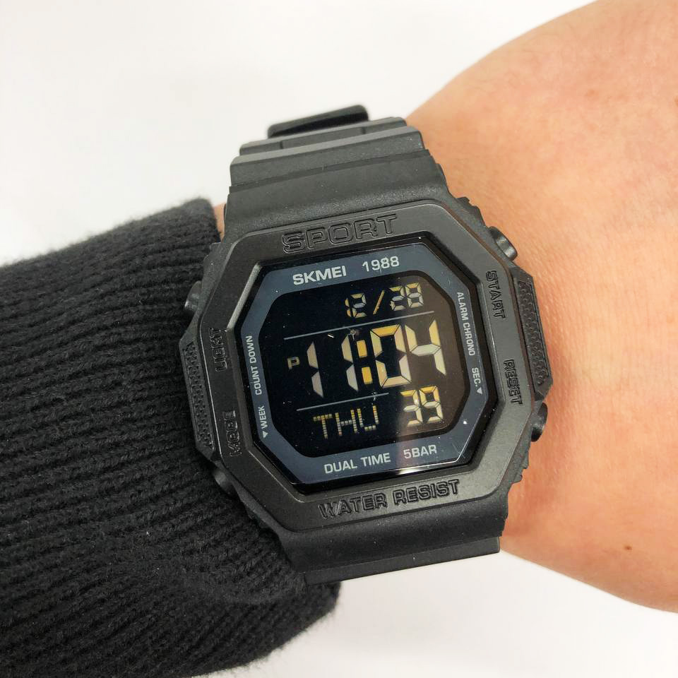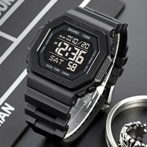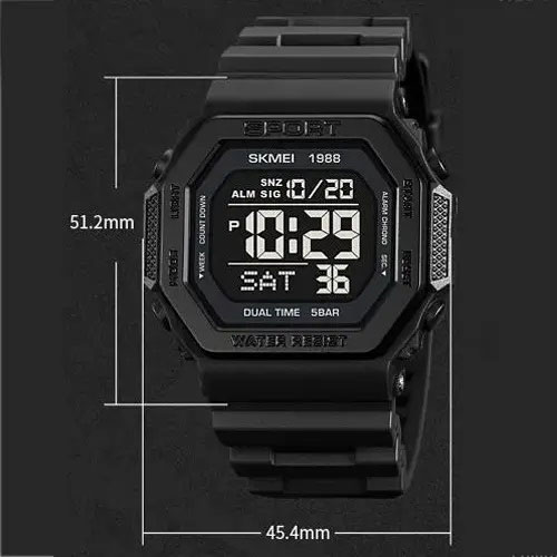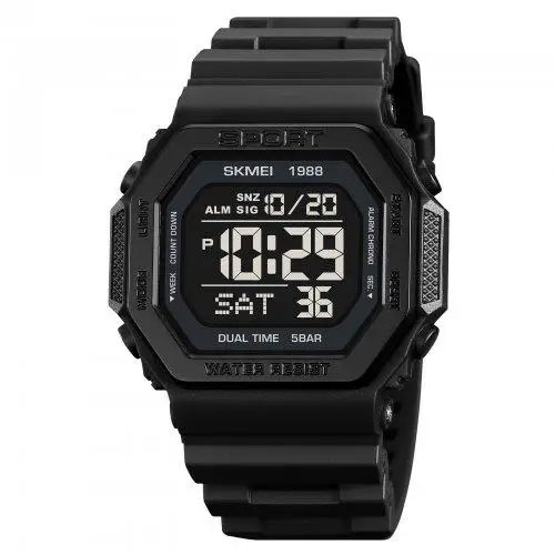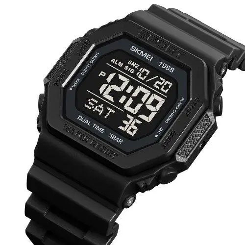 Модель оснащена широким набором функцій: подвійний час, секундомір, таймер, кілька будильників, індикація дати та дня тижня, підсвітка дисплея. Завдяки водозахисту 5 ATM цей годинник підходить для щоденного носіння, занять спортом і навіть плавання без занурення. SKMEI 1988BK — це вдале поєднання практичності, стилю та доступної ціни.