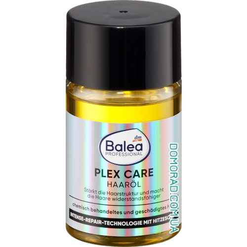 Олія для волосся Plex Care від Balea Professional з технологією Intense Repair зміцнює хімічно оброблене та пошкоджене волосся зсередини. Допомагає заповнити і згладити прогалини в пошкодженій структурі волосся. Завдяки термозахисту до 230°C забезпечує ідеальний догляд перед термоукладанням. Для зміцнення структури волосся та більшої пружності.