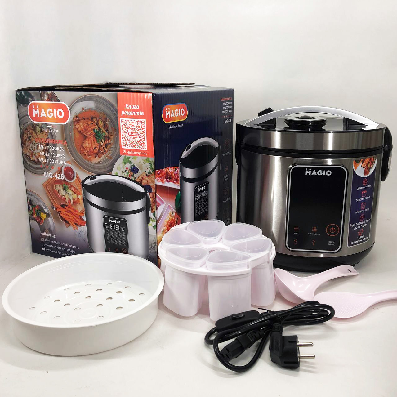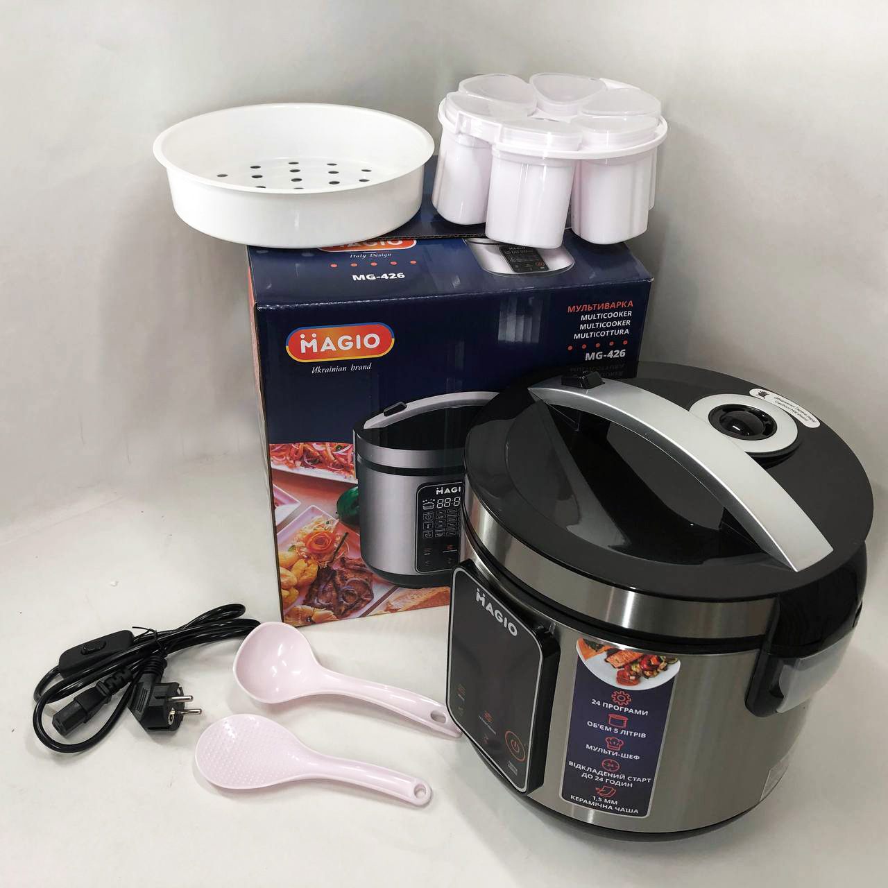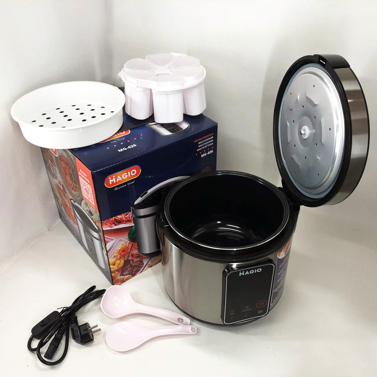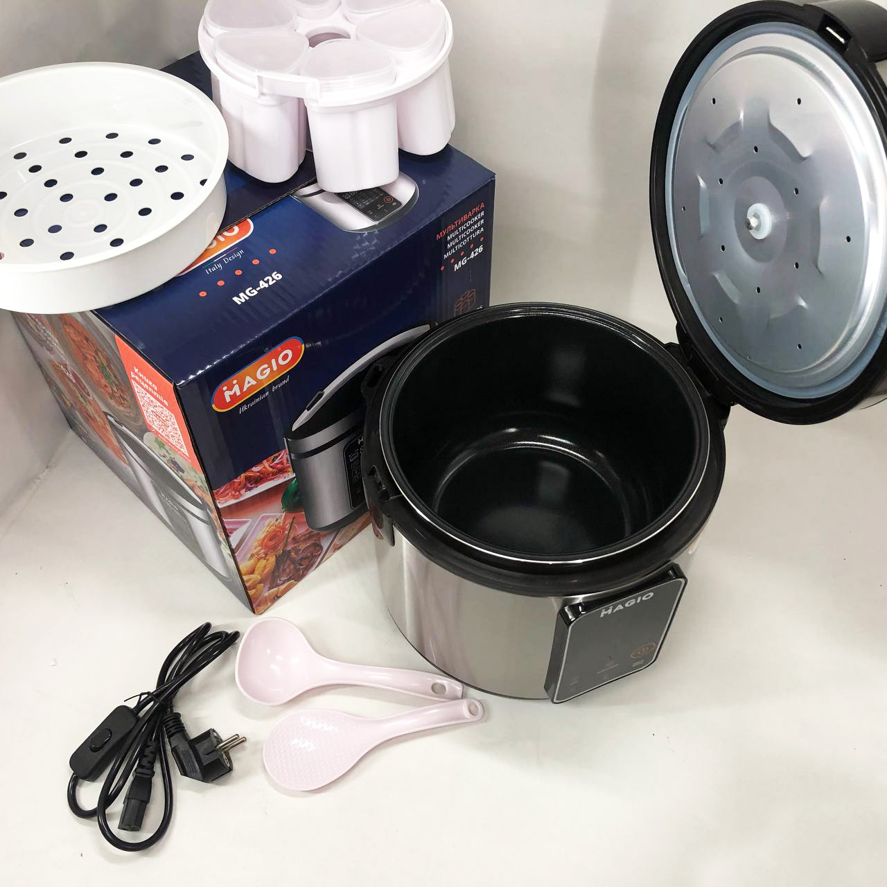 - Комплектація: мультиварка, чаша, мерний стакан, форми для йогурту, пароварка, ложки, інструкція, шнур з вимикачем
