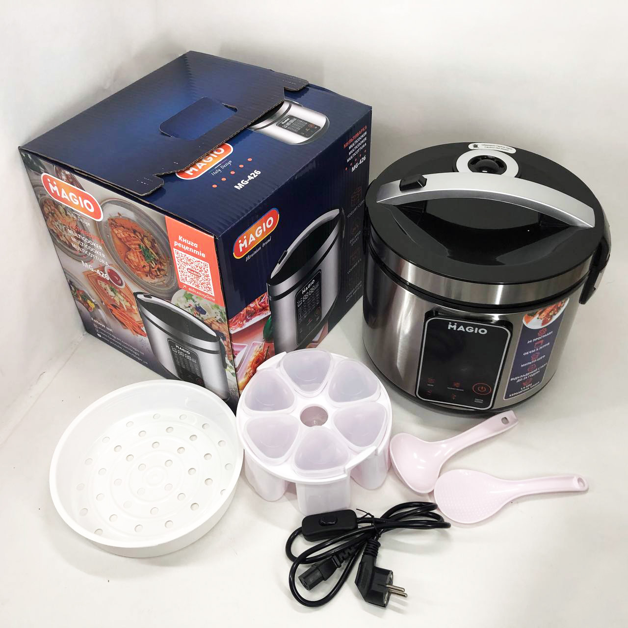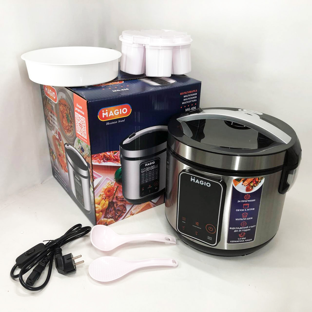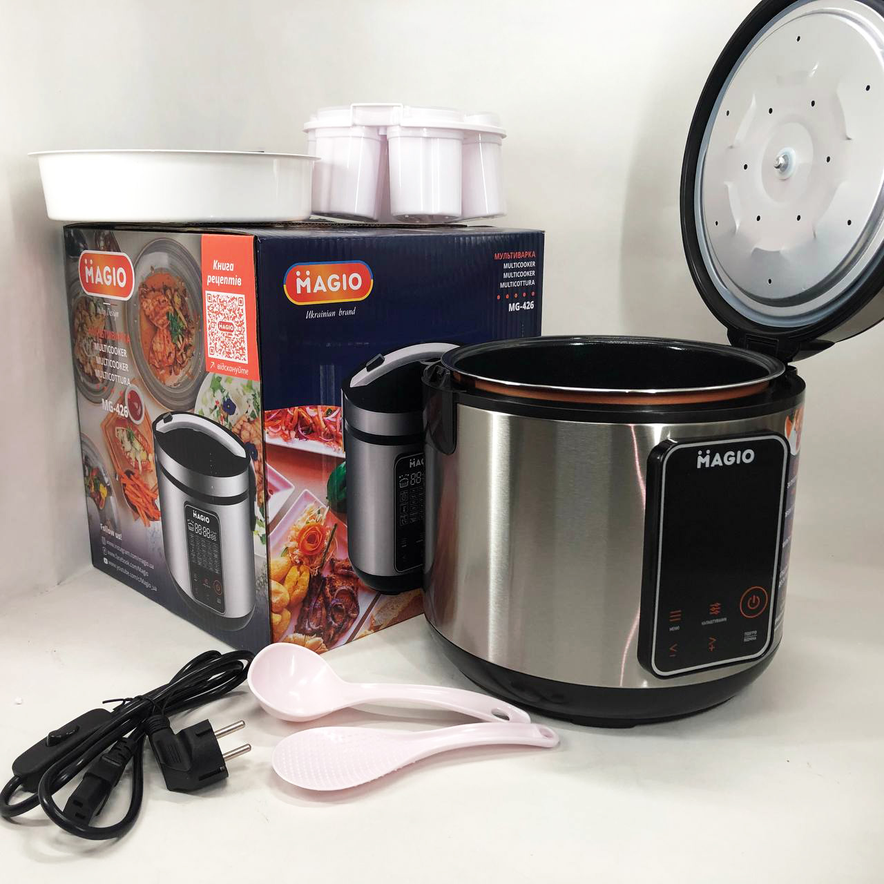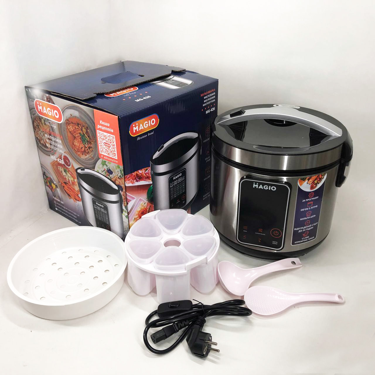 - Комплектація: мультиварка, чаша, мерний стакан, форми для йогурту, пароварка, ложки, інструкція, шнур з вимикачем