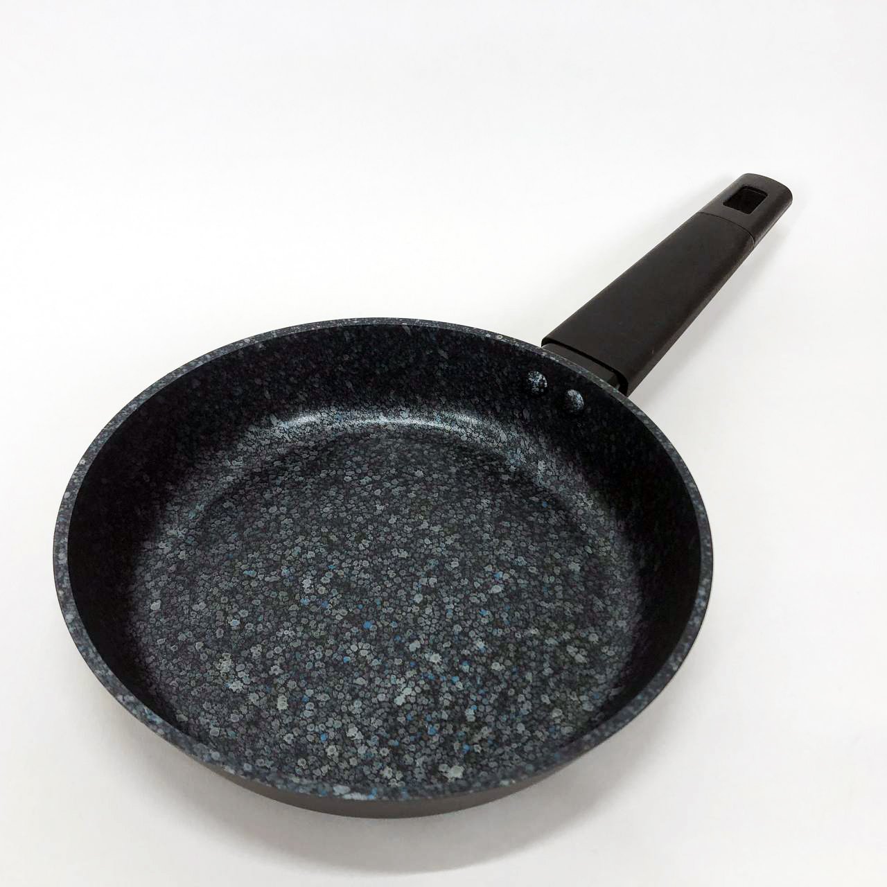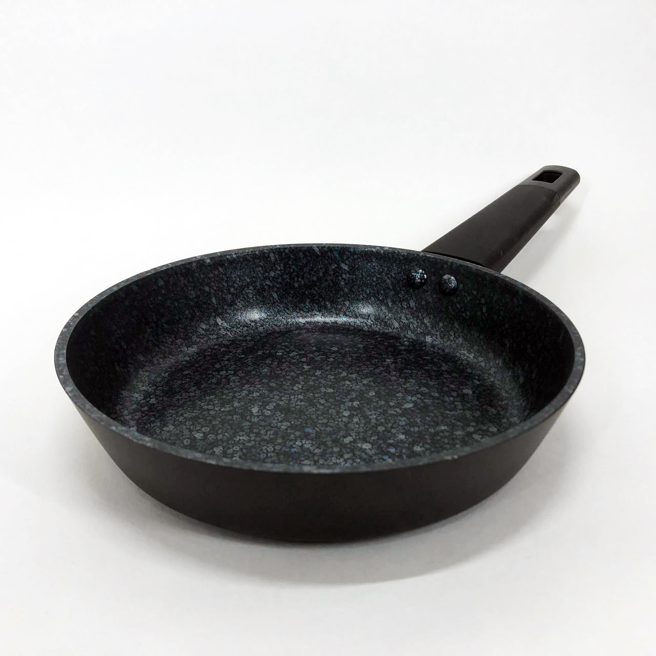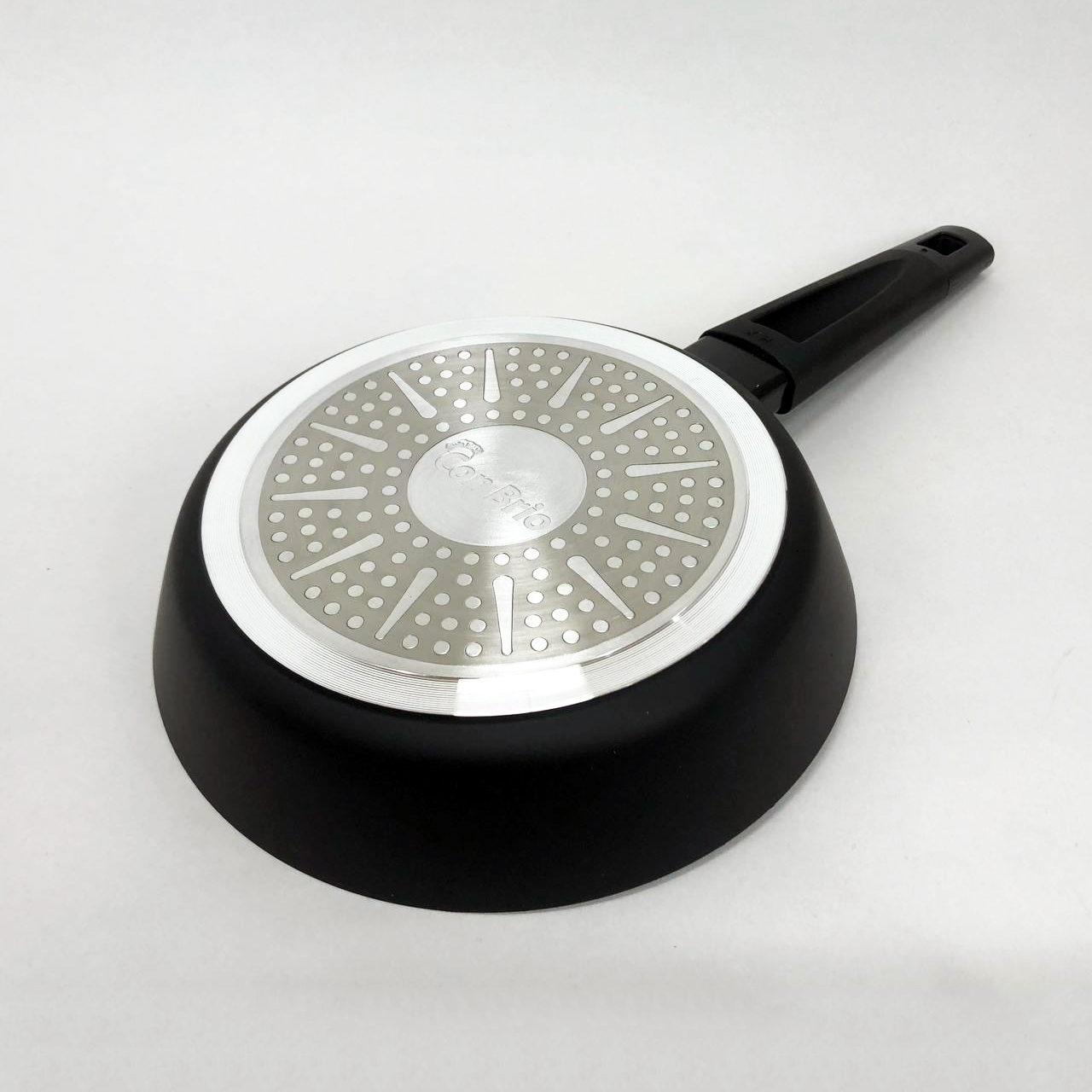 - Потовщений алюмінієвий корпус виготовлений за технологією гарячого кування, що дозволяє рівномірніше розподіляти температуру по всій поверхні сковороди.