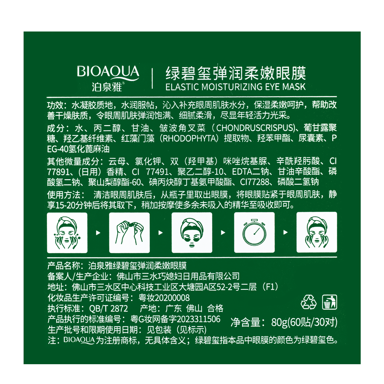 Гідрогелеві патчі під очі для підвищення еластичності шкіри Bioaqua Elastic Moisturizing Eye Mask з морськими водоростямиГідрогелеві патчі під очі Bioaqua з гіалуроновою кислотою й морськими водоростями насичують зневоднену шкіру повік вологою, зменшують видимість мімічних зморщок, підтягують епідерміс, усувають набряки та темні круги, уповільнюють передчасне старіння шкіри. Застосування засобу для догляду за шкірою навколо очей повертають цій зоні обличчя еластичність, пружність. Ваш погляд стає виразнішим, пронизливішим і випромінює енергію.Активні компоненти формули патчів для повік — морські водорості. Вони живлять, зволожують, підвищують еластичність, заспокоюють, зменшують набряки, стимулюють вироблення колагену;Спосіб застосування: за допомогою пластикової лопатки витягти патч із банки та нанести на попередньо очищену шкіру під очима. Залишити приблизно на 20-30 хвилин. Акуратно зняти маску та злегка помасажувати шкіру кінчиками пальців.У баночці 60 патчів.Вага: 80 г