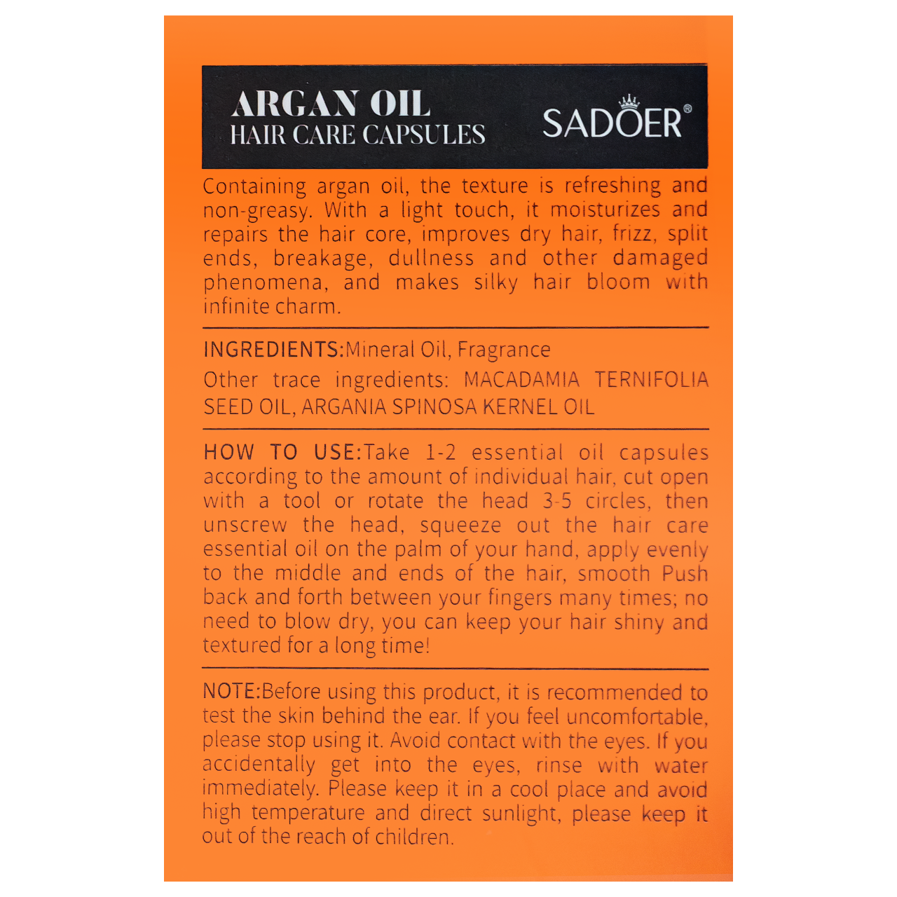 Вітамінні капсули для відновлення пошкодженого волосся SADOER Argan Oil Hair Care Capsules з аргановою (марокканською) олієюКапсули з маслом аргани від SADOER призначені для відновлення пошкодженого, сухого та неслухняного волосся. Засіб допомагає розгладити волосся, надаємо їм приголомшливу шовковистість і сяйво, відновлює пошкоджені ділянки, зменшує ламкість і посіченість кінчиків. Регулярно застосовуючи масло для волосся в капсулах, ви помітите, як локони набувають силу, еластичність, красу. Капсули підходять для всіх типів волосся.Активний компонент засобу догляду за пошкодженим волоссям:арганова олія - відома своїми поживними та зволожуючими властивостями;